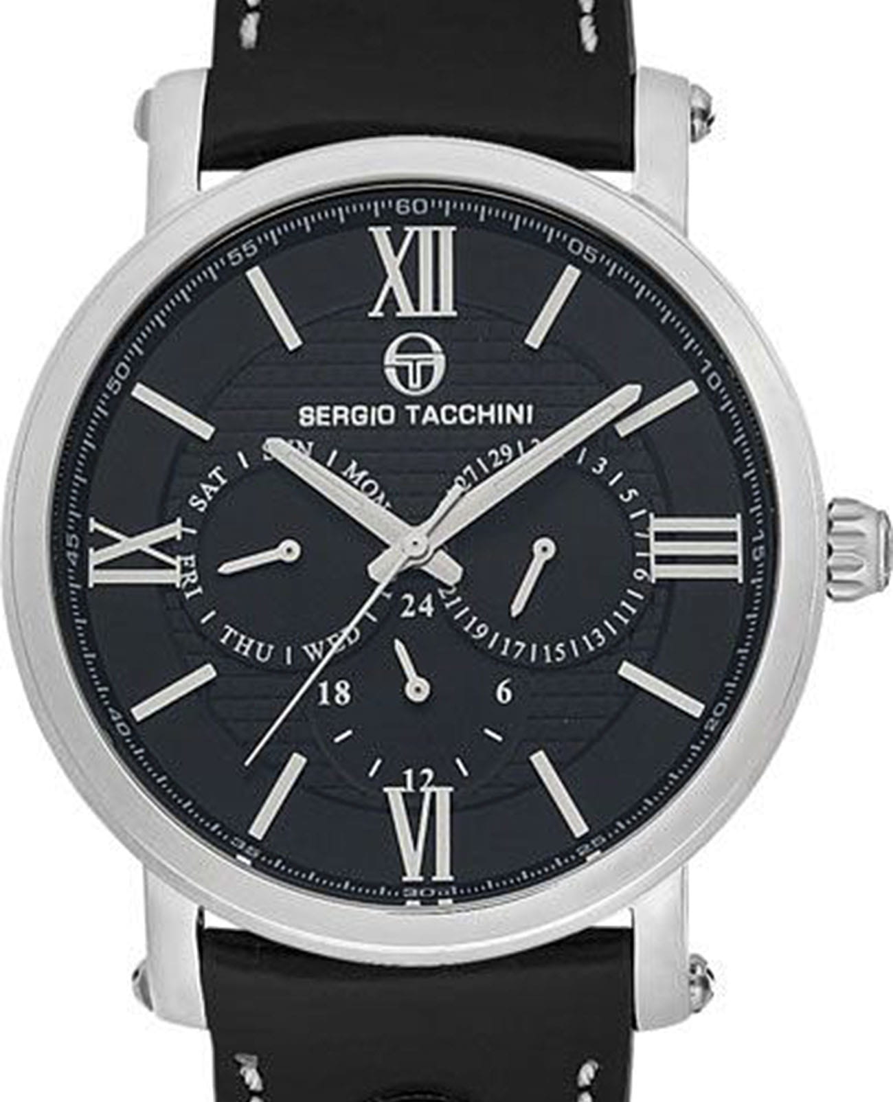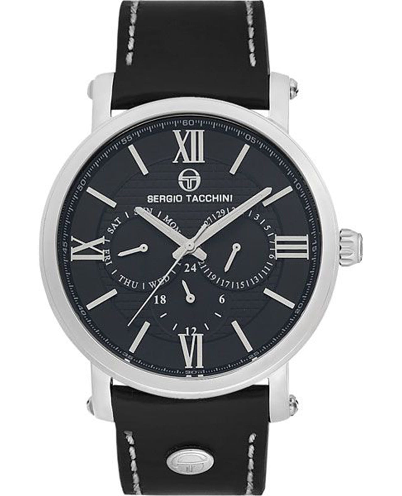 Мужские кварцевые часы Sergio Tacchini из коллекции City — это стильный аксессуар с классическими чертами для уверенного покорения городской жизни. Корпус диаметром 46 мм выполнен из нержавеющей стали 316L. Циферблат чёрного цвета оформлен индексами и стрелками. Указатели дня недели и даты вынесены на отдельные субциферблаты, также присутствует индикация 24-часового формата времени. Циферблат защищён минеральным стекломМинеральное стеклоМинеральное стекло представляет собой искусственно выращенный минерал кварца. Такое стекло отличается особой устойчивостью к повреждениям и царапинам. Уступает по некоторым качествам сапфировому стеклу. с антибликовым покрытиемАнтибликовое покрытиеСлой оксида металла в 0,13-0,3 микрон, благодаря которому стекло часов не бликует и не отражает свет. Антибликовое покрытие уменьшает отражение света в 10 раз, обеспечивая отличную читаемость показателей циферблата.. Механизм — японский кварцевый калибр Miyota 6P29. Часы оснащены кожаным ремешком чёрного цвета с стандартной. Водонепроницаемость 100 м позволяет использовать часы в повседневных условиях и для плавания. Идеальный выбор для тех, кто ценит функциональность и элегантный дизайн.