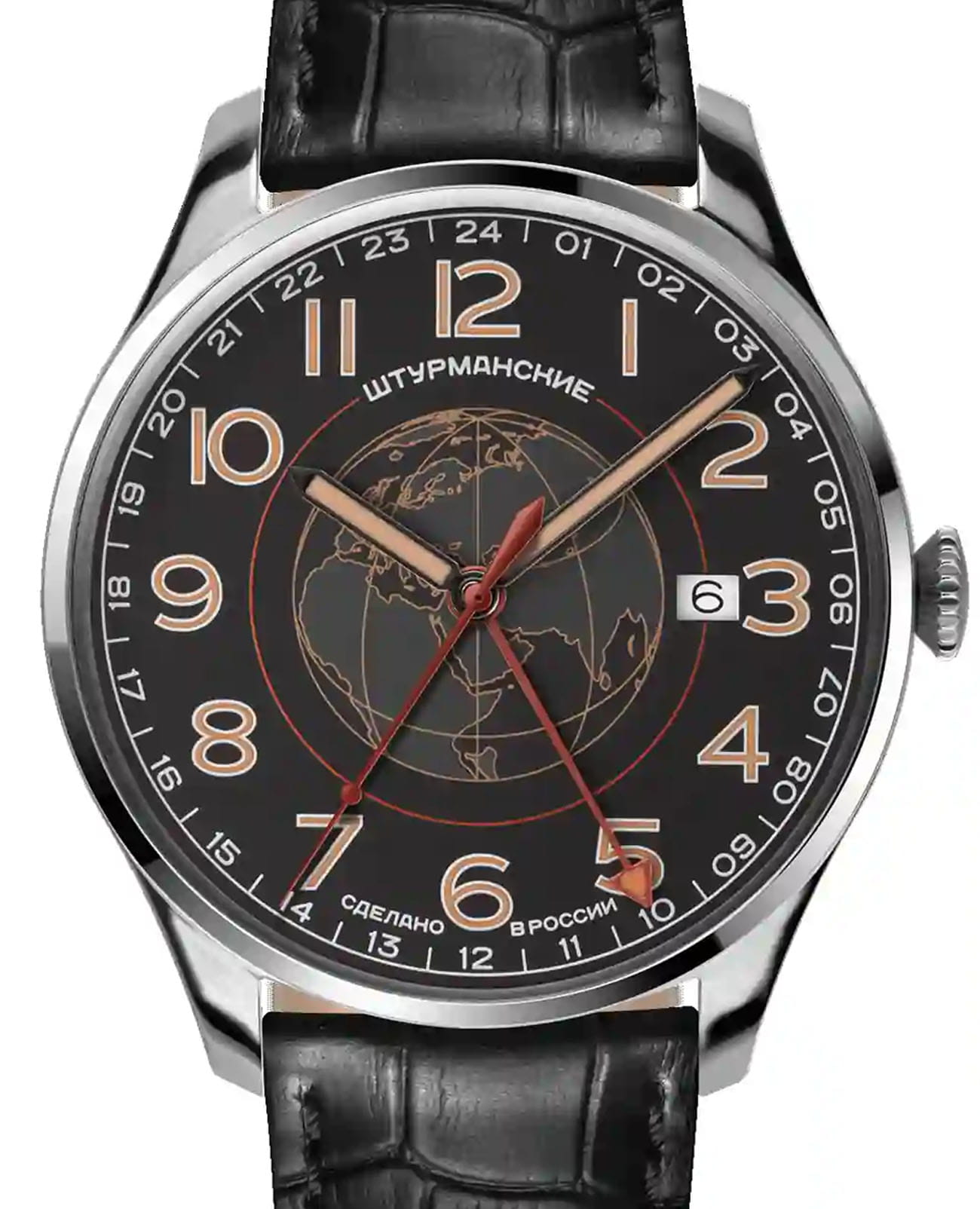 Штурманские мужские российские кварцевые часы с минеральным стекломМинеральное стеклоМинеральное стекло представляет собой искусственно выращенный минерал кварца. Такое стекло отличается особой устойчивостью к повреждениям и царапинам. Уступает по некоторым качествам сапфировому стеклу. кварцевый механизм с высокой точностью. Класс водозащиты: 50 метров, позволит защитить корпус от случайных брызг или капель дождя. Корпус часов изготовлен из стали. Кожаный ремешок на стандартной застёжке. Стрелки и метки с люминесцентным покрытиемЛюминесцентное покрытиеПозволяет считывать показания времени в темноте. Производители наносят на стрелки, часовые индексы, безель или поверхность циферблата светонакопительный состав, дающий холодное свечение.. Окошко даты находится в положении 3 часа.