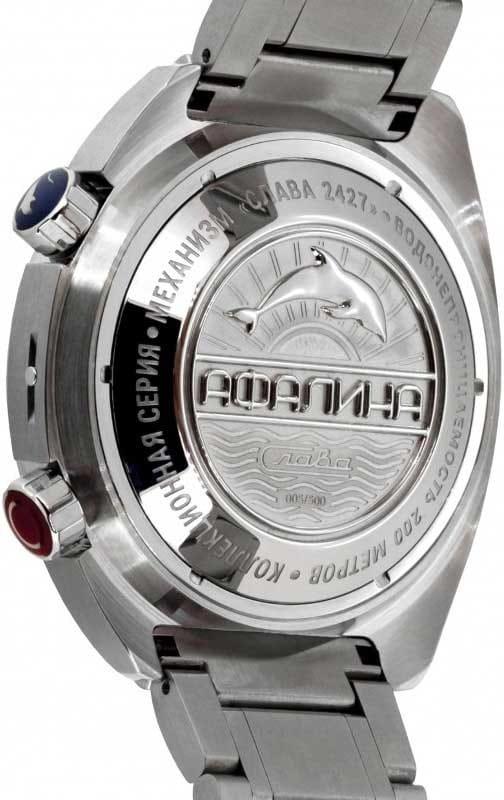 Коллекционные часы Слава Афалина 2430583/100-2427 — это превосходный выбор для тех, кто ценит стиль и функциональность. Модель из лимитированной серии, состоящей всего из 500 экземпляров, отличается прочным стальным корпусом и предназначена для любителей дайвинга. Часы оснащены надежным механическим механизмом с автоподзаводом и водозащитой до 200 метров, что делает их идеальными для подводных приключений. Бирюзовый циферблат дополняется стрелками с люминесцентным покрытиемЛюминесцентное покрытиеПозволяет считывать показания времени в темноте. Производители наносят на стрелки, часовые индексы, безель или поверхность циферблата светонакопительный состав, дающий холодное свечение. для отличной видимости в условиях низкой освещенности, а сапфировое стеклоСапфировое стеклоПрочный и надёжный материал из кристалла сапфира синтетического происхождения, характеризующийся особой твёрдостью и устойчивостью к царапинам и повреждениям. с антибликовым покрытиемАнтибликовое покрытиеСлой оксида металла в 0,13-0,3 микрон, благодаря которому стекло часов не бликует и не отражает свет. Антибликовое покрытие уменьшает отражение света в 10 раз, обеспечивая отличную читаемость показателей циферблата. защищает от царапин и бликов. Основная заводная головка расположена на корпусе ближе к отметке ''4 часа'', она позволяет настраивать время и заводить часы перед погружением. С помощью второй головки, расположенной у отметки ''2 часа'', можно управлять вращающимся внутренним кольцом безеляБезельВнешний ободок, закрепляющий стекло. В спортивных часах так называется поворотное кольцо с делениями на циферблате, выполняет роль таймера – замеряет отрезки времени на шкале. Неподвижный безель – элемент декора. Однонаправленно вращающийся безель на дайверских часах позволяет фиксировать моменты погружения и выныривания на поверхность. с PVDPVDУльтратонкое покрытие наносится в технике вакуумного напыления, сочетает в себе нитрид титана особой прочности со слоем золота или оксида хрома. Несёт в себе декоративную или защитную функцию. покрытием бирюзового цвета и фиксировать его в нужном положении. Окошко даты и дня недели удобно расположено на отметке "3 часа", а профессиональная "дайвинг-застежка" стального браслета имеет удлинение для гидрокостюма. Особая забота о природе: часть средств от продажи данной модели перечисляется в центр спасения дельфинов "Дельфа". Часы серии "Афалина" — это не только функциональный аксессуар, но и символ вашей поддержки благородного дела.