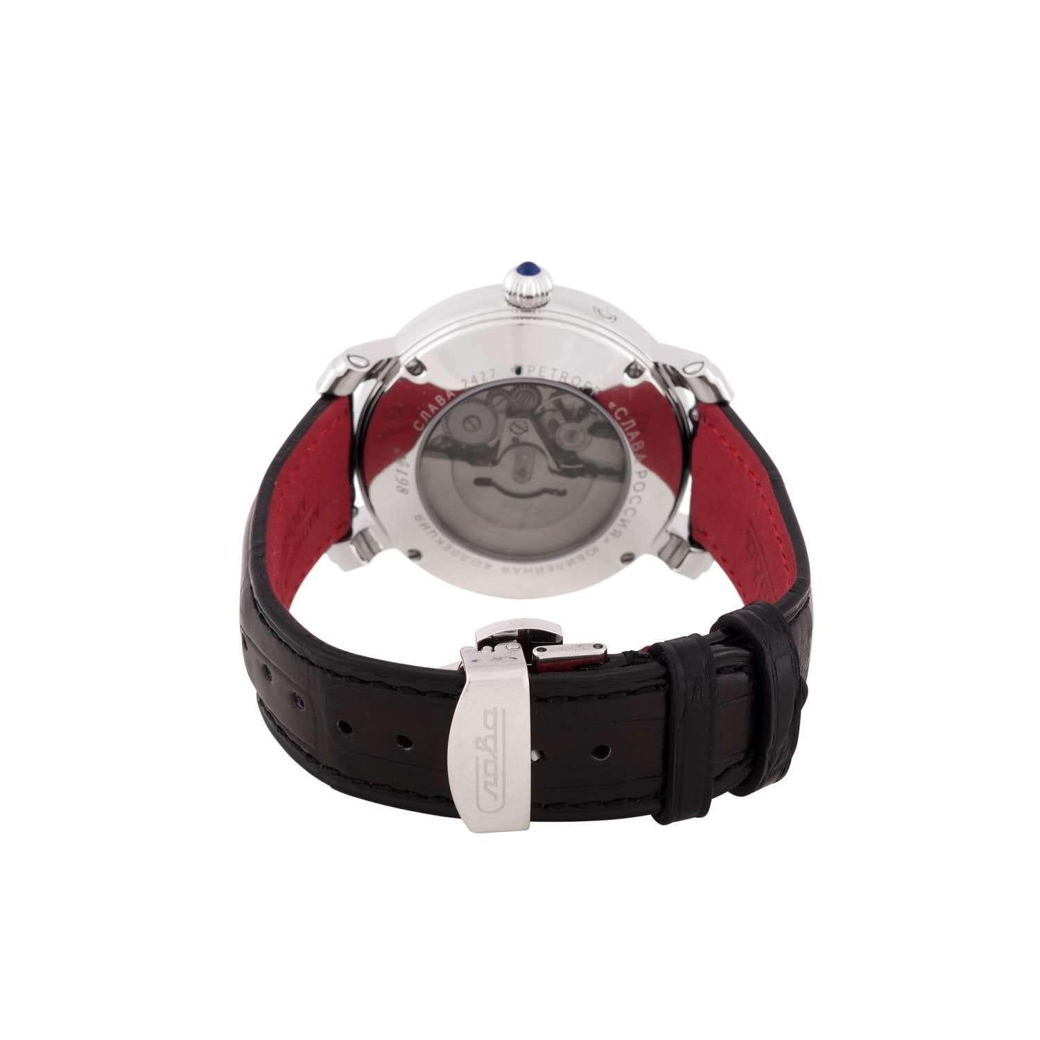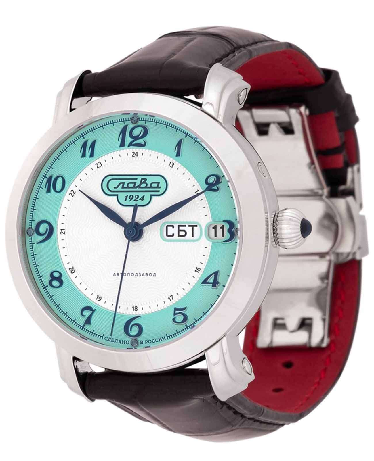 Наручные часы Слава Слава России 2440617/300-2427 — воплощение классического стиля и исключительного качества, произведенные в России. Эта модель из лимитированной коллекции, выпущенной в количестве всего 300 экземпляров, станет великолепным дополнением к вашему образу. Часы оснащены надежным механическим механизмом "Слава 2427" с автоподзаводом, обеспечивающим точный ход и оснащены двойным календарем, что позволяет всегда быть в курсе текущей даты. Корпус из нержавеющей стали с родиевым покрытием диаметром 41 мм и толщиной 14,2 мм отличается высокой прочностью и водозащитой до 5 ATM. Серебристо-бирюзовый циферблат с арабскими цифрами защищен сапфировым стекломСапфировое стеклоПрочный и надёжный материал из кристалла сапфира синтетического происхождения, характеризующийся особой твёрдостью и устойчивостью к царапинам и повреждениям., устойчивым к царапинам, что позволяет надолго сохранить безупречный вид часов. На 3 часах расположено окошко с указателем даты и дня недели. Кожаный ремень из крокодила с застежкой «бабочка»Застёжка "бабочка"Такой вид застёжки дополняется предохранителями, помогающими избежать случайного раскрытия браслета. Обладают изящным исполнением. добавляет элегантности и комфорта, создавая ощущение роскоши и изысканности. Эта модель станет идеальным выбором для тех, кто ценит традиции и высокое качество в сочетании с современным дизайном.