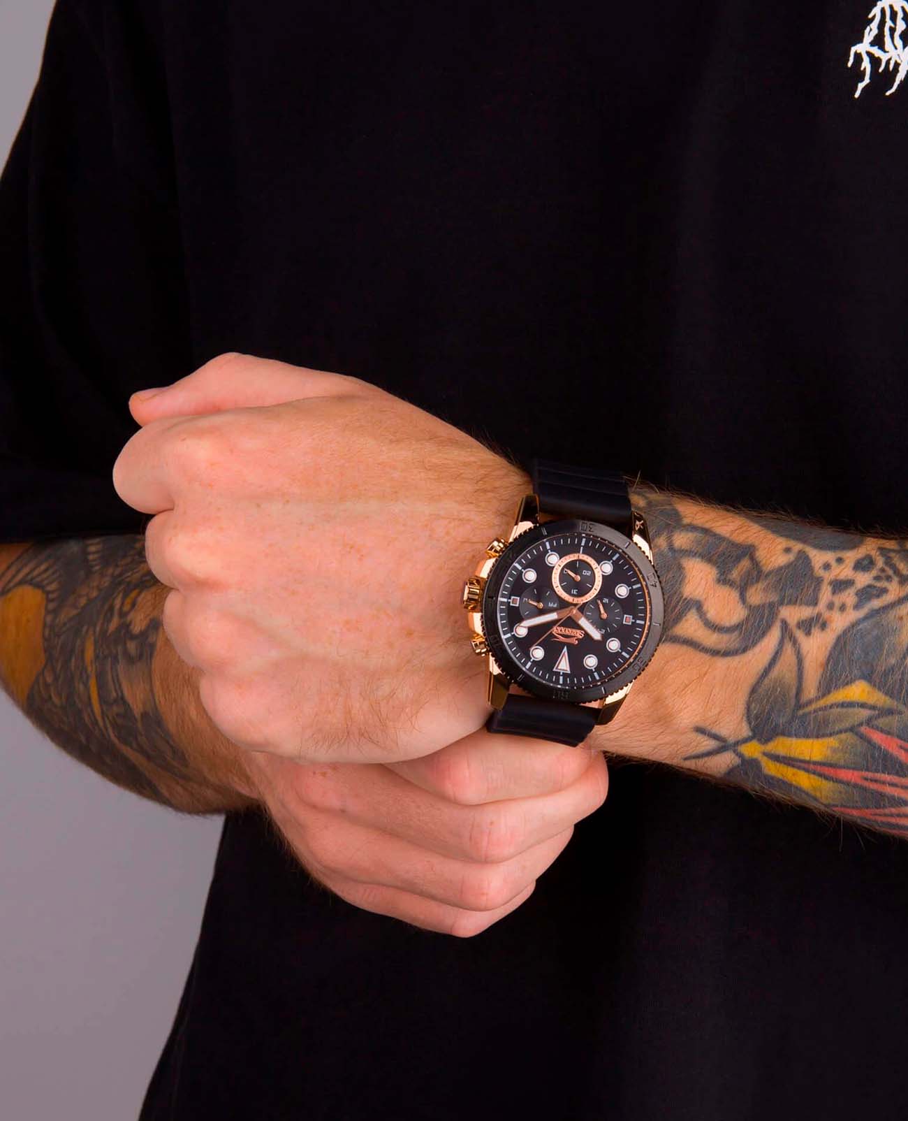Мужские наручные часы Slazenger SL.09.2012.2.04 сочетают в себе спортивный дизайн и функциональность современных технологий. Модель обладает круглым корпусом диаметром 47 мм, изготовленным из суперметалла с IP-покрытиемIP-покрытиеМетод ионного напыления. Демонстрирует повышенную устойчивость к истиранию, окислению и химическим веществам. Под воздействием высокого давления и температуры около 1500°C молекулы металла надёжно соединяются с частицами корпуса часов., что обеспечивает высокую устойчивость к внешним воздействиям. Браслет выполнен из черного силикона, а застежка стандартная, гарантирующая комфортное ношение и безопасность. Черный циферблат дополнен индексами и тремя малыми циферблатами для отображения даты, дня недели и времени в формате 24 часа, а также защищен прочным минеральным стекломМинеральное стеклоМинеральное стекло представляет собой искусственно выращенный минерал кварца. Такое стекло отличается особой устойчивостью к повреждениям и царапинам. Уступает по некоторым качествам сапфировому стеклу. с люминесцентным покрытиемЛюминесцентное покрытиеПозволяет считывать показания времени в темноте. Производители наносят на стрелки, часовые индексы, безель или поверхность циферблата светонакопительный состав, дающий холодное свечение. для лучшей видимости в темноте. Часы работают на кварцевом механизме, что гарантирует точное время без необходимости подзаводки. БезельБезельВнешний ободок, закрепляющий стекло. В спортивных часах так называется поворотное кольцо с делениями на циферблате, выполняет роль таймера – замеряет отрезки времени на шкале. Неподвижный безель – элемент декора. Однонаправленно вращающийся безель на дайверских часах позволяет фиксировать моменты погружения и выныривания на поверхность. с IP-покрытиемIP-покрытиеМетод ионного напыления. Демонстрирует повышенную устойчивость к истиранию, окислению и химическим веществам. Под воздействием высокого давления и температуры около 1500°C молекулы металла надёжно соединяются с частицами корпуса часов.. Водонепроницаемость часов достигает уровня 5 атмосфер (WR50), что позволяет использовать их во время плавания, однако не рекомендуется для глубоководного дайвинга.