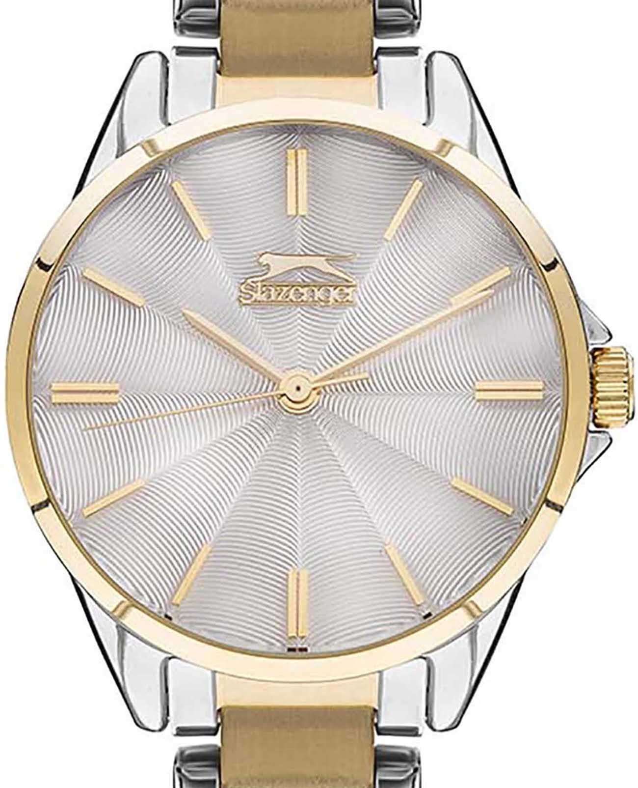 Slazenger SL.09.2023.3.03 – элегантные женские часы, сочетающие стильный дизайн и функциональность. Корпус диаметром 36 мм и толщиной 9 мм выполнен из суперметалла, обеспечивающего прочность и долговечность. Циферблат защищён минеральным стекломМинеральное стеклоМинеральное стекло представляет собой искусственно выращенный минерал кварца. Такое стекло отличается особой устойчивостью к повреждениям и царапинам. Уступает по некоторым качествам сапфировому стеклу., устойчивым к царапинам. БезельБезельВнешний ободок, закрепляющий стекло. В спортивных часах так называется поворотное кольцо с делениями на циферблате, выполняет роль таймера – замеряет отрезки времени на шкале. Неподвижный безель – элемент декора. Однонаправленно вращающийся безель на дайверских часах позволяет фиксировать моменты погружения и выныривания на поверхность. с PVD-покрытиемPVDУльтратонкое покрытие наносится в технике вакуумного напыления, сочетает в себе нитрид титана особой прочности со слоем золота или оксида хрома. Несёт в себе декоративную или защитную функцию.. Часы оснащены точным кварцевым механизмом, обеспечивающим надёжное отображение времени. Браслет из суперметалла с PVD-покрытиемPVDУльтратонкое покрытие наносится в технике вакуумного напыления, сочетает в себе нитрид титана особой прочности со слоем золота или оксида хрома. Несёт в себе декоративную или защитную функцию. шириной 16 мм оснащён раскладной застёжкойРаскладная застёжкаТакой тип застёжки используется только на браслетах из металла. Она никогда не раскрывается полностью, происходит разделение на 2 и более частей. Раскладывающая застёжка снизит вероятность потери часов к минимуму., обеспечивающей комфортное ношение и надёжную фиксацию на запястье. Водозащита до 30 метров (3 ATM) защищает часы от случайных брызг и дождя, делая их подходящими для повседневного использования.