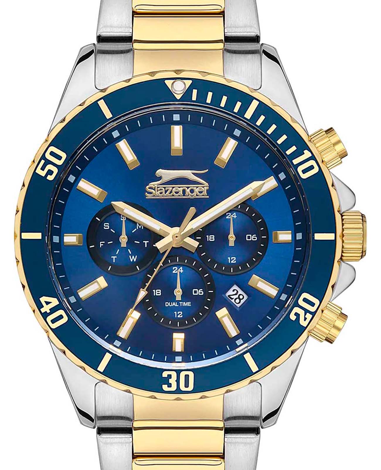Мужские наручные часы Slazenger SL.09.2091.2.02 сочетают в себе классический дизайн и надежность современных технологий. Модель обладает круглым корпусом диаметром 44 мм, изготовленным из суперметалла, что обеспечивает высокую устойчивость к внешним воздействиям. БезельБезельВнешний ободок, закрепляющий стекло. В спортивных часах так называется поворотное кольцо с делениями на циферблате, выполняет роль таймера – замеряет отрезки времени на шкале. Неподвижный безель – элемент декора. Однонаправленно вращающийся безель на дайверских часах позволяет фиксировать моменты погружения и выныривания на поверхность. с IP-покрытиемIP-покрытиеМетод ионного напыления. Демонстрирует повышенную устойчивость к истиранию, окислению и химическим веществам. Под воздействием высокого давления и температуры около 1500°C молекулы металла надёжно соединяются с частицами корпуса часов., добавляя модели элегантности и защищая поверхность от повреждений. Браслет выполнен из суперметалла с частичным IP-покрытиемIP-покрытиеМетод ионного напыления. Демонстрирует повышенную устойчивость к истиранию, окислению и химическим веществам. Под воздействием высокого давления и температуры около 1500°C молекулы металла надёжно соединяются с частицами корпуса часов. цвета желтого золота с раскладной застежкойРаскладной замокДанный вариант застежки используется только на часах с металлическим браслетом. Отличительная особенность такого крепления в том, что длина браслета становится универсальной и вы можете самостоятельно отрегулировать нужный вам размер – застежка просто двигается по браслету часов., гарантирующей комфортное ношение и безопасность. Циферблат темно-синего цвета выполнен по технологии Sunray (солнечные лучи), декорирован индексами в виде штрихов и логотипом бренда, а стрелки имеют люминесцентное покрытиеЛюминесцентное покрытиеПозволяет считывать показания времени в темноте. Производители наносят на стрелки, часовые индексы, безель или поверхность циферблата светонакопительный состав, дающий холодное свечение., обеспечивающее читаемость времени даже при недостаточной освещенности. Для защиты используется минеральное стеклоМинеральное стеклоМинеральное стекло представляет собой искусственно выращенный минерал кварца. Такое стекло отличается особой устойчивостью к повреждениям и царапинам. Уступает по некоторым качествам сапфировому стеклу., обеспечивающее прочную защиту от царапин. Часы работают на кварцевом механизме, что гарантирует точное время без необходимости подзаводки, и оснащены функцией второго часового поясаВторой часовой поясФункция, позволяющая отображать время двух часовых поясов одновременно., делая их практичными для путешествий. Водонепроницаемость часов достигает 5 атмосфер (WR50), что позволяет использовать их во время плавания, однако они не предназначены для дайвинга или других водных видов спорта. Толщина модели составляет 12 мм, а производитель предоставляет гарантию сроком 12 месяцев. SL.09.2091.2.02 — это стильный аксессуар, который станет отличным дополнением как формального, так и casual образа мужчины.