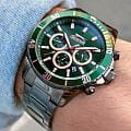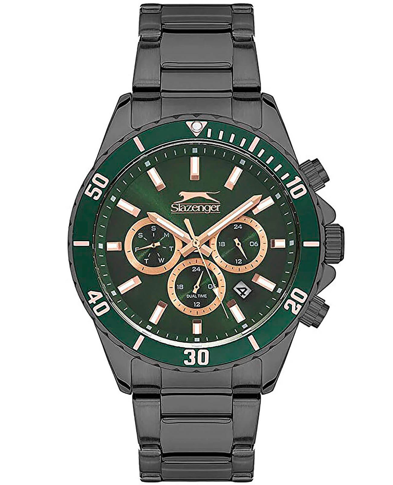 Мужские кварцевые часы Slazenger SL.09.2091.2.03 — это стильный и функциональный аксессуар для тех, кто ценит актуальный дизайн и точность. Корпус круглой формы выполнен из прочного суперметалла с IP-покрытиемIP-покрытиеМетод ионного напыления. Демонстрирует повышенную устойчивость к истиранию, окислению и химическим веществам. Под воздействием высокого давления и температуры около 1500°C молекулы металла надёжно соединяются с частицами корпуса часов. и защищён минеральным стекломМинеральное стеклоМинеральное стекло представляет собой искусственно выращенный минерал кварца. Такое стекло отличается особой устойчивостью к повреждениям и царапинам. Уступает по некоторым качествам сапфировому стеклу.. Циферблат зелёного цвета выполнен по технологии Sunray с эффектом «солнечных лучей», оформлен штриховыми метками и украшен логотипом бренда. Часы отображают основное время в 12- и 24-часовом формате, а также оснащены отдельными циферблатами для индикации второго часового пояса, дня недели и текущего времени в 24-часовом формате. Окошко даты расположено между отметками 4 и 5 часов. Стрелки и метки покрыты люминесцентным покрытиемЛюминесцентное покрытиеПозволяет считывать показания времени в темноте. Производители наносят на стрелки, часовые индексы, безель или поверхность циферблата светонакопительный состав, дающий холодное свечение., обеспечивая хорошую читаемость в темноте. Рифлёная заводная головка с защитой гарантирует надёжность в повседневной эксплуатации. Браслет из суперметалла с IP-покрытиемIP-покрытиеМетод ионного напыления. Демонстрирует повышенную устойчивость к истиранию, окислению и химическим веществам. Под воздействием высокого давления и температуры около 1500°C молекулы металла надёжно соединяются с частицами корпуса часов. фиксируется на раскладной застёжкеРаскладная застёжкаТакой тип застёжки используется только на браслетах из металла. Она никогда не раскрывается полностью, происходит разделение на 2 и более частей. Раскладывающая застёжка снизит вероятность потери часов к минимуму.. Водонепроницаемость 50 м позволяет использовать часы в повседневных условиях, защищая от случайных брызг и капель дождя. Модель сочетает в себе современный дизайн, насыщенную функциональность и надёжность, подчёркивая индивидуальность владельца.