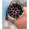 Мужские наручные часы Slazenger SL.09.2091.2.05 сочетают в себе классический дизайн и современные технологии. Модель обладает круглым корпусом диаметром 44 мм из суперметалла, поворотный безельБезельВнешний ободок, закрепляющий стекло. В спортивных часах так называется поворотное кольцо с делениями на циферблате, выполняет роль таймера – замеряет отрезки времени на шкале. Неподвижный безель – элемент декора. Однонаправленно вращающийся безель на дайверских часах позволяет фиксировать моменты погружения и выныривания на поверхность. с IP-покрытиемIP-покрытиеМетод ионного напыления. Демонстрирует повышенную устойчивость к истиранию, окислению и химическим веществам. Под воздействием высокого давления и температуры около 1500°C молекулы металла надёжно соединяются с частицами корпуса часов., что обеспечивает устойчивость к царапинам и коррозии. Браслет изготовлен из нержавеющей стали с частичным IP-покрытиемIP-покрытиеМетод ионного напыления. Демонстрирует повышенную устойчивость к истиранию, окислению и химическим веществам. Под воздействием высокого давления и температуры около 1500°C молекулы металла надёжно соединяются с частицами корпуса часов. на раскладной застежкеРаскладной замокДанный вариант застежки используется только на часах с металлическим браслетом. Отличительная особенность такого крепления в том, что длина браслета становится универсальной и вы можете самостоятельно отрегулировать нужный вам размер – застежка просто двигается по браслету часов., гарантирующей удобство и надежность при ношении. Циферблат черного цвета украшен стрелками с люминесцентным покрытиемЛюминесцентное покрытиеПозволяет считывать показания времени в темноте. Производители наносят на стрелки, часовые индексы, безель или поверхность циферблата светонакопительный состав, дающий холодное свечение., что обеспечивает читаемость времени даже в условиях слабого освещения. Для защиты циферблата используется минеральное стеклоМинеральное стеклоМинеральное стекло представляет собой искусственно выращенный минерал кварца. Такое стекло отличается особой устойчивостью к повреждениям и царапинам. Уступает по некоторым качествам сапфировому стеклу., устойчивое к царапинам и повреждениям. Часы оснащены кварцевым механизмом Miyota, обеспечивающим точность хода с погрешностью не более ±15 секунд в месяц. Модель также включает функции отображения даты, дня недели и второго часового поясаВторой часовой поясФункция, позволяющая отображать время двух часовых поясов одновременно., что делает ее практичной для повседневного использования. Водонепроницаемость часов составляет 5 атмосфер (50 метров), что позволяет использовать их при плавании, но не рекомендуется для дайвинга. Вес модели — 143 грамма, а производитель предоставляет гарантию сроком 12 месяцев. SL.09.2091.2.05 — это стильный аксессуар, который подчеркнет стиль и практичность в любом образе мужчины.