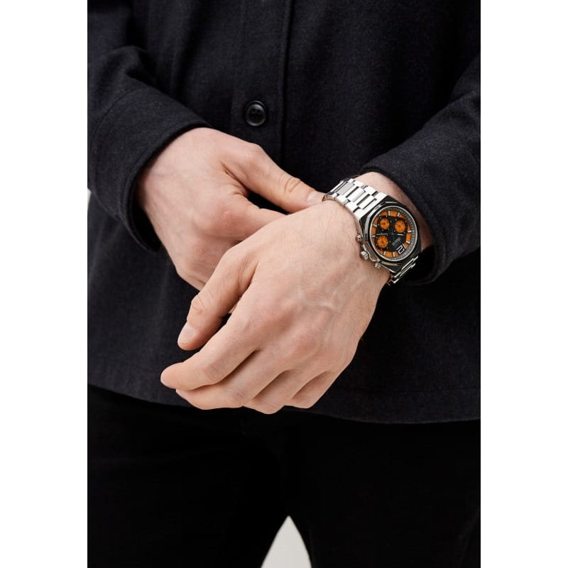 Часы Slazenger SL.09.2106.2.08 представляют собой идеальное сочетание элегантности и функциональности для стильных мужчин. Их оранжево-черный циферблат, защищенный прочным минеральным стекломМинеральное стеклоМинеральное стекло представляет собой искусственно выращенный минерал кварца. Такое стекло отличается особой устойчивостью к повреждениям и царапинам. Уступает по некоторым качествам сапфировому стеклу., обрамлен корпусом из суперметалла диаметром 41 мм, а безельБезельВнешний ободок, закрепляющий стекло. В спортивных часах так называется поворотное кольцо с делениями на циферблате, выполняет роль таймера – замеряет отрезки времени на шкале. Неподвижный безель – элемент декора. Однонаправленно вращающийся безель на дайверских часах позволяет фиксировать моменты погружения и выныривания на поверхность. этих часов из суперметалла с черным IP-покрытиемIP-покрытиеМетод ионного напыления. Демонстрирует повышенную устойчивость к истиранию, окислению и химическим веществам. Под воздействием высокого давления и температуры около 1500°C молекулы металла надёжно соединяются с частицами корпуса часов.. Кварцевый механизм гарантирует точность, а водозащита 5 ATM позволяет не волноваться о случайных брызгах. Стальной браслет из суперметалла с раскладной застёжкойРаскладная застёжкаТакой тип застёжки используется только на браслетах из металла. Она никогда не раскрывается полностью, происходит разделение на 2 и более частей. Раскладывающая застёжка снизит вероятность потери часов к минимуму., придает часовому изделию современный и изысканный вид. Функции 24-часового указателя времени, а также отображение даты и дня недели обеспечивают дополнительное удобство в повседневной жизни. Люминесцентное покрытиеЛюминесцентное покрытиеПозволяет считывать показания времени в темноте. Производители наносят на стрелки, часовые индексы, безель или поверхность циферблата светонакопительный состав, дающий холодное свечение. на стрелках и метках обеспечивает удобство считывания времени в темное время суток.