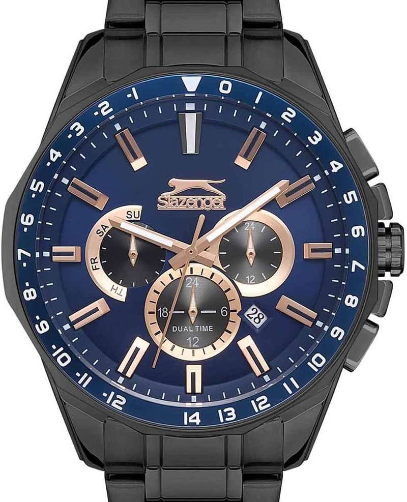 Эксклюзивные мужские наручные часы Slazenger SL.09.2112.2.03 - воплощение стиля и инноваций. Корпус из суперпрочного металла с черным IP-покрытиемIP-покрытиеМетод ионного напыления. Демонстрирует повышенную устойчивость к истиранию, окислению и химическим веществам. Под воздействием высокого давления и температуры около 1500°C молекулы металла надёжно соединяются с частицами корпуса часов. и элегантным круглым дизайном и фирменным логотипом. Многофункциональный синий циферблат  с метками в виде штрихов выполнен по технологии Sunray (солнечные лучи) и украшен логотипом бренда. Часы оснащены двойным форматом времени (12 и 24 часа), вторым часовым поясом и удобным окошком даты. Отдельные циферблаты предоставляют расширенную информацию. Неподвижный безельБезельВнешний ободок, закрепляющий стекло. В спортивных часах так называется поворотное кольцо с делениями на циферблате, выполняет роль таймера – замеряет отрезки времени на шкале. Неподвижный безель – элемент декора. Однонаправленно вращающийся безель на дайверских часах позволяет фиксировать моменты погружения и выныривания на поверхность. из суперметалла с синим IP-покрытиемIP-покрытиеМетод ионного напыления. Демонстрирует повышенную устойчивость к истиранию, окислению и химическим веществам. Под воздействием высокого давления и температуры около 1500°C молекулы металла надёжно соединяются с частицами корпуса часов.. Рифленая заводная головка с защитой и надежный браслет с черным IP-покрытиемIP-покрытиеМетод ионного напыления. Демонстрирует повышенную устойчивость к истиранию, окислению и химическим веществам. Под воздействием высокого давления и температуры около 1500°C молекулы металла надёжно соединяются с частицами корпуса часов. и раскладной застёжкойРаскладная застёжкаТакой тип застёжки используется только на браслетах из металла. Она никогда не раскрывается полностью, происходит разделение на 2 и более частей. Раскладывающая застёжка снизит вероятность потери часов к минимуму. дополняют дизайн. Люминесцентное покрытиеЛюминесцентное покрытиеПозволяет считывать показания времени в темноте. Производители наносят на стрелки, часовые индексы, безель или поверхность циферблата светонакопительный состав, дающий холодное свечение. на стрелках и метках обеспечивает отличную видимость в темноте. Минеральное стеклоМинеральное стеклоМинеральное стекло представляет собой искусственно выращенный минерал кварца. Такое стекло отличается особой устойчивостью к повреждениям и царапинам. Уступает по некоторым качествам сапфировому стеклу. защищает циферблат от внешних воздействий. Эти часы - идеальный выбор для ценителей качества и индивидуальности, подчеркивающий статус и безупречный вкус владельца.