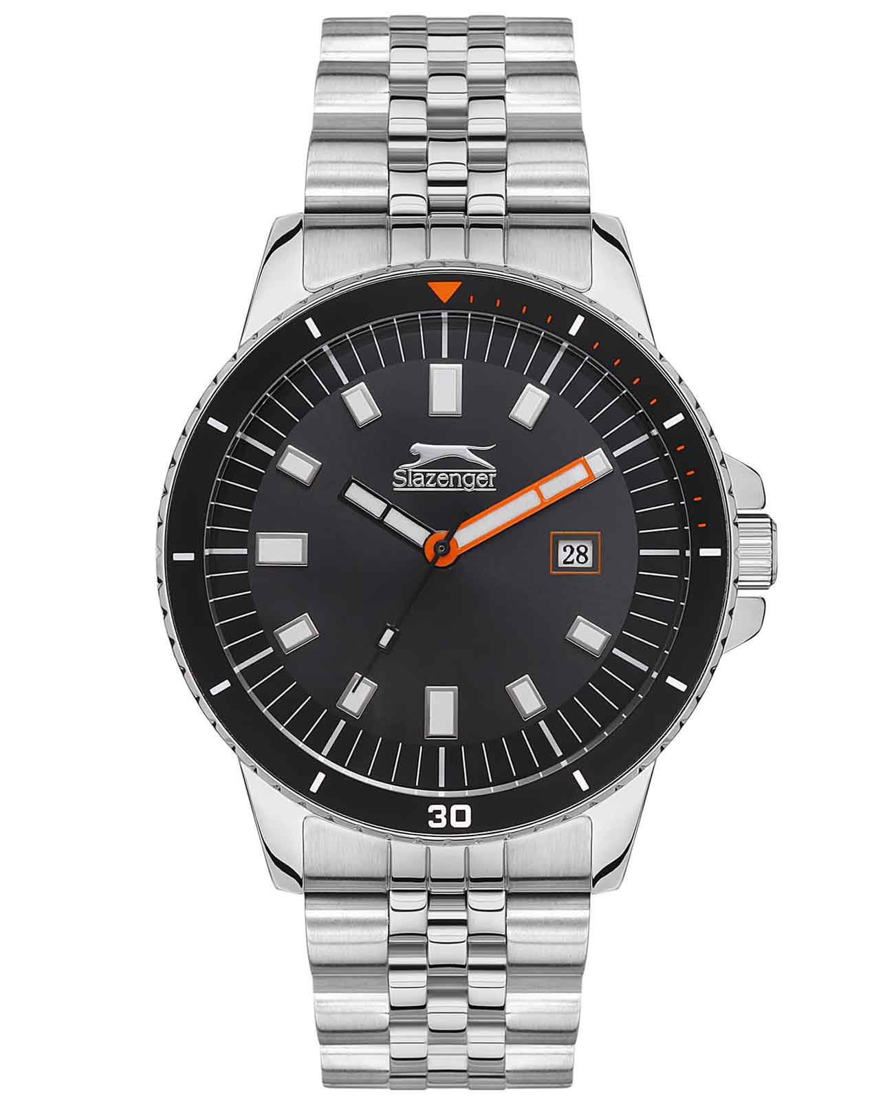 Часы Slazenger SL.09.2135.1.03 воплощают в себе элегантность и практичность, идеально подходящие для современных мужчин. Их черный циферблат, защищенный минеральным стекломМинеральное стеклоМинеральное стекло представляет собой искусственно выращенный минерал кварца. Такое стекло отличается особой устойчивостью к повреждениям и царапинам. Уступает по некоторым качествам сапфировому стеклу., заключен в серебристый корпус диаметром 45 мм, который изготовлен из прочного суперметалла. Неподвижный безельБезельВнешний ободок, закрепляющий стекло. В спортивных часах так называется поворотное кольцо с делениями на циферблате, выполняет роль таймера – замеряет отрезки времени на шкале. Неподвижный безель – элемент декора. Однонаправленно вращающийся безель на дайверских часах позволяет фиксировать моменты погружения и выныривания на поверхность. с IP-покрытиемIP-покрытиеМетод ионного напыления. Демонстрирует повышенную устойчивость к истиранию, окислению и химическим веществам. Под воздействием высокого давления и температуры около 1500°C молекулы металла надёжно соединяются с частицами корпуса часов. черного цвета. Часы оснащены удобным окошком даты и стрелками контрастного цвета. Надежный кварцевый механизм обеспечивает точность, а водозащита 5 ATM делает их устойчивыми к воздействию воды. Стальной браслет из суперметалла имеет раскладную застёжкуРаскладная застёжкаТакой тип застёжки используется только на браслетах из металла. Она никогда не раскрывается полностью, происходит разделение на 2 и более частей. Раскладывающая застёжка снизит вероятность потери часов к минимуму., что подчеркивает современный стиль и позволяет легко снимать часы. Люминесцентное покрытиеЛюминесцентное покрытиеПозволяет считывать показания времени в темноте. Производители наносят на стрелки, часовые индексы, безель или поверхность циферблата светонакопительный состав, дающий холодное свечение. на стрелках и метках обеспечивает отличную видимость в темноте.