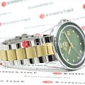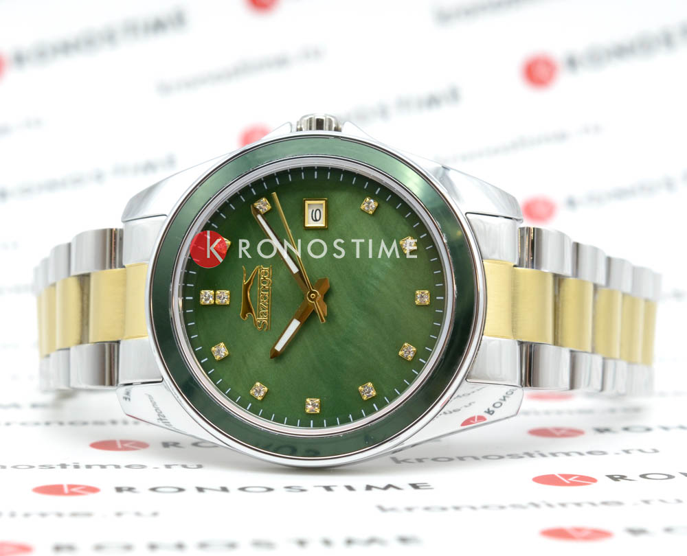 Женские наручные часы Slazenger SL.09.2142.3.03 сочетают в себе элегантный дизайн и надежность современных технологий. Модель обладает корпусом размерами 37 мм, изготовленным из суперметалла, что обеспечивает высокую устойчивость к внешним воздействиям. БезельБезельВнешний ободок, закрепляющий стекло. В спортивных часах так называется поворотное кольцо с делениями на циферблате, выполняет роль таймера – замеряет отрезки времени на шкале. Неподвижный безель – элемент декора. Однонаправленно вращающийся безель на дайверских часах позволяет фиксировать моменты погружения и выныривания на поверхность. с IP-покрытиемIP-покрытиеМетод ионного напыления. Демонстрирует повышенную устойчивость к истиранию, окислению и химическим веществам. Под воздействием высокого давления и температуры около 1500°C молекулы металла надёжно соединяются с частицами корпуса часов.. Браслет из суперметалла с частичным IP-покрытиемIP-покрытиеМетод ионного напыления. Демонстрирует повышенную устойчивость к истиранию, окислению и химическим веществам. Под воздействием высокого давления и температуры около 1500°C молекулы металла надёжно соединяются с частицами корпуса часов. гарантирует комфортное ношение и стильный внешний вид. Циферблат зеленого цвета декорирован кристаллами в виде меток. Для защиты используется минеральное стеклоМинеральное стеклоМинеральное стекло представляет собой искусственно выращенный минерал кварца. Такое стекло отличается особой устойчивостью к повреждениям и царапинам. Уступает по некоторым качествам сапфировому стеклу., обеспечивающее прочную защиту от царапин. Часы работают на кварцевом механизме, поэтому гарантирует точное время без необходимости подзаводки. Модель также оснащена функцией отображения даты, делая ее практичной для повседневного использования. Водонепроницаемость часов достигает 3 атмосфер, что позволяет использовать их при мытье рук или хождении под мелким дождем, однако не рекомендуется для плавания или других водных видов спорта. Вес модели составляет 97 грамм.
