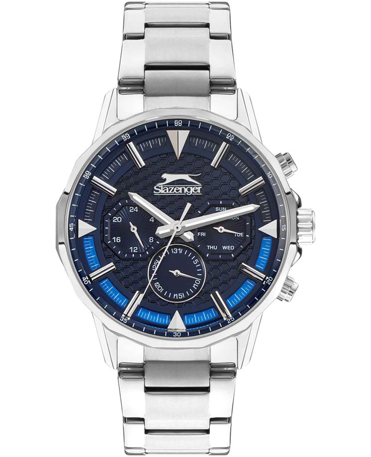 Стильные мужские наручные часы Slazenger SL.09.2216.2.04 станут идеальным аксессуаром для современного мужчины. Этот британский бренд славится своим качеством и надежностью, а данная модель не является исключением. Часы оснащены кварцевым механизмом, что обеспечивает точность хода и долговечность использования. Корпус часов выполнен из металла, а прочное минеральное стеклоМинеральное стеклоМинеральное стекло представляет собой искусственно выращенный минерал кварца. Такое стекло отличается особой устойчивостью к повреждениям и царапинам. Уступает по некоторым качествам сапфировому стеклу. защищает циферблат от царапин и повреждений. Элегантный металлический браслет серебристого цвета снабжен удобной раскладной застёжкойРаскладная застёжкаТакой тип застёжки используется только на браслетах из металла. Она никогда не раскрывается полностью, происходит разделение на 2 и более частей. Раскладывающая застёжка снизит вероятность потери часов к минимуму., что гарантирует комфортное ношение на запястье. Ширина браслета составляет 22 мм, что придает часам солидный вид. Диаметр корпуса равен 45 мм, а толщина 12 мм, что делает эту модель заметной, но в то же время не громоздкой. Водозащита уровня WR 50 позволяет использовать часы в повседневной жизни, не беспокоясь о случайных попаданиях воды. Стрелки снабжены люминесцентным покрытиемЛюминесцентное покрытиеПозволяет считывать показания времени в темноте. Производители наносят на стрелки, часовые индексы, безель или поверхность циферблата светонакопительный состав, дающий холодное свечение., что позволяет легко считывать время в темноте. Функциональные возможности часов включают отображение даты, дня недели и времени в 24-часовом формате на дополнительных малых циферблатах. Это делает модель не только стильной, но и практичной в использовании.