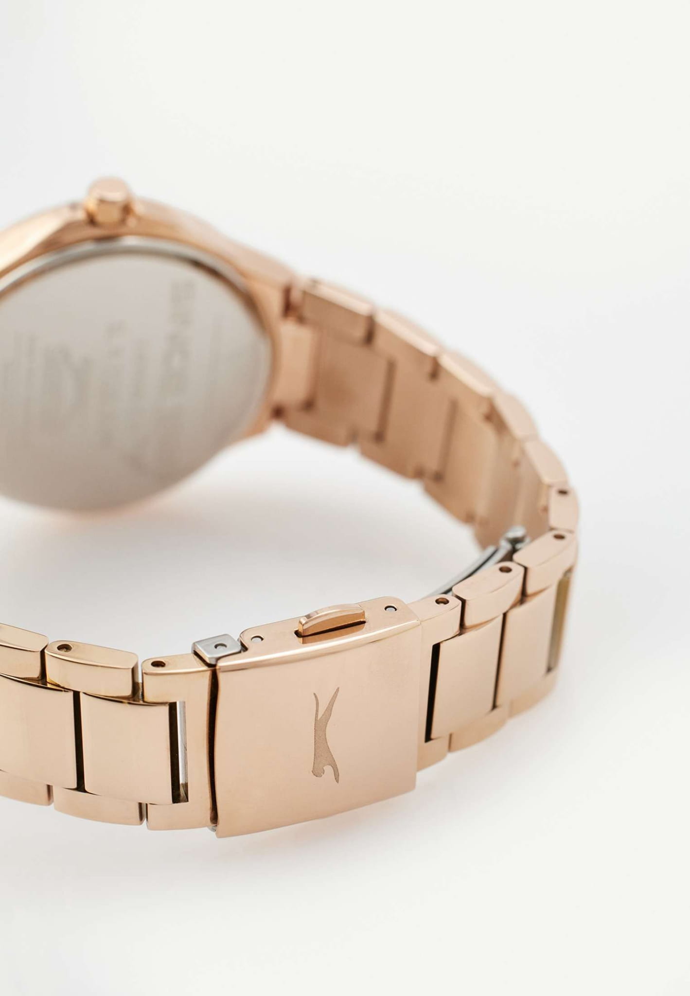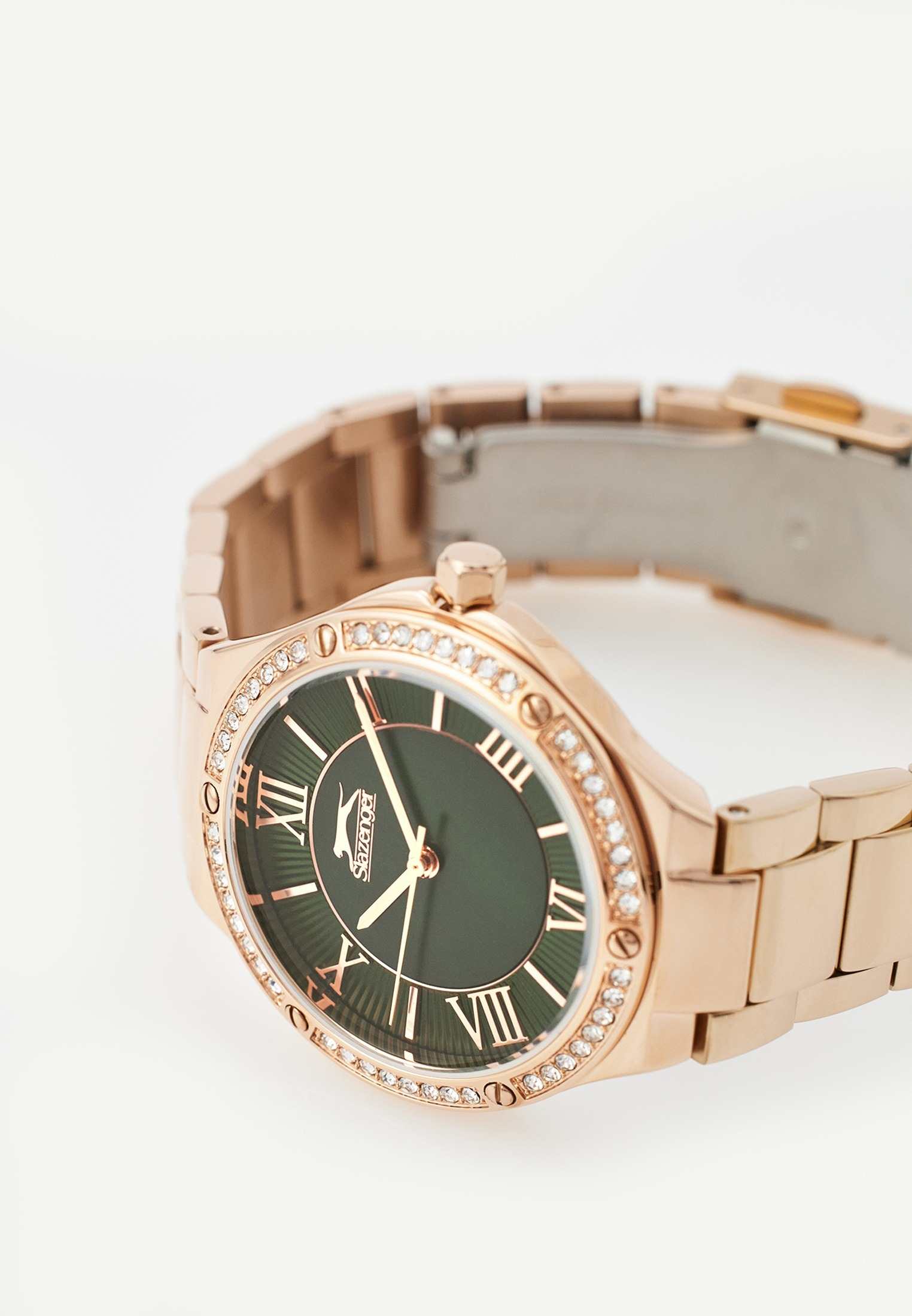 Часы Slazenger SL.09.2225.3.04 — это изысканный аксессуар, который подчеркнёт ваш стиль и индивидуальность. Модель оснащена надёжным кварцевым механизмом, обеспечивающим точность хода. Корпус из прочного металла с розово-золотистым IP-покрытиемIP-покрытиеМетод ионного напыления. Демонстрирует повышенную устойчивость к истиранию, окислению и химическим веществам. Под воздействием высокого давления и температуры около 1500°C молекулы металла надёжно соединяются с частицами корпуса часов. диаметром 35 мм, а безельБезельВнешний ободок, закрепляющий стекло. В спортивных часах так называется поворотное кольцо с делениями на циферблате, выполняет роль таймера – замеряет отрезки времени на шкале. Неподвижный безель – элемент декора. Однонаправленно вращающийся безель на дайверских часах позволяет фиксировать моменты погружения и выныривания на поверхность. украшен сияющими кристаллами. Перламутровый темно-зеленый циферблат придаёт часам особый шарм. Металлический браслет с розово-золотистым IP-покрытиемIP-покрытиеМетод ионного напыления. Демонстрирует повышенную устойчивость к истиранию, окислению и химическим веществам. Под воздействием высокого давления и температуры около 1500°C молекулы металла надёжно соединяются с частицами корпуса часов. с удобной раскладной застёжкойРаскладная застёжкаТакой тип застёжки используется только на браслетах из металла. Она никогда не раскрывается полностью, происходит разделение на 2 и более частей. Раскладывающая застёжка снизит вероятность потери часов к минимуму. гармонично дополняет изящный дизайн. Минеральное стеклоМинеральное стеклоМинеральное стекло представляет собой искусственно выращенный минерал кварца. Такое стекло отличается особой устойчивостью к повреждениям и царапинам. Уступает по некоторым качествам сапфировому стеклу. защищает циферблат от царапин, а водозащита уровня WR 30 позволяет не беспокоиться о случайных каплях воды. Заводная головка оснащена специальной защитой. Эти часы станут прекрасным выбором для тех, кто ценит сочетание элегантности и функциональности.