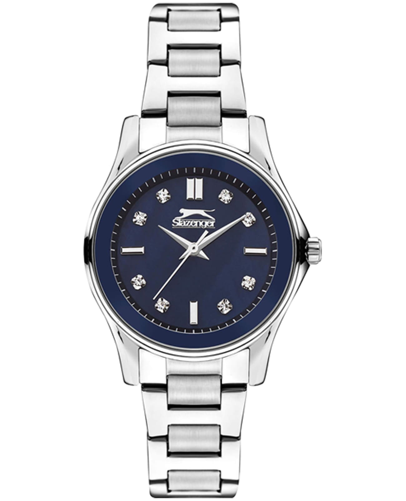Женские наручные часы Slazenger SL.09.2235.3.07 сочетают в себе классический дизайн и надежность современных технологий. Модель обладает круглым корпусом диаметром 32 мм, изготовленным из суперметалла, что обеспечивает высокую устойчивость к внешним воздействиям. Индексы украшены фианитами. Браслет выполнен из суперметалла с раскладной застежкойРаскладной замокДанный вариант застежки используется только на часах с металлическим браслетом. Отличительная особенность такого крепления в том, что длина браслета становится универсальной и вы можете самостоятельно отрегулировать нужный вам размер – застежка просто двигается по браслету часов., гарантирующей комфортное ношение и безопасность. Циферблат синего цвета декорирован серебристыми стрелками и индексами, которые обеспечивают читаемость времени даже в условиях недостаточной освещенности. Для защиты используется минеральное стеклоМинеральное стеклоМинеральное стекло представляет собой искусственно выращенный минерал кварца. Такое стекло отличается особой устойчивостью к повреждениям и царапинам. Уступает по некоторым качествам сапфировому стеклу., обеспечивающее прочную защиту от царапин. Часы работают на кварцевом механизме, что гарантирует точное время без необходимости подзаводки. Водонепроницаемость часов достигает 3 атмосфер, что позволяет использовать их при мытье рук или хождении под мелким дождем, однако не рекомендуется для плавания или других водных видов спорта. Вес модели составляет 72 грамма.