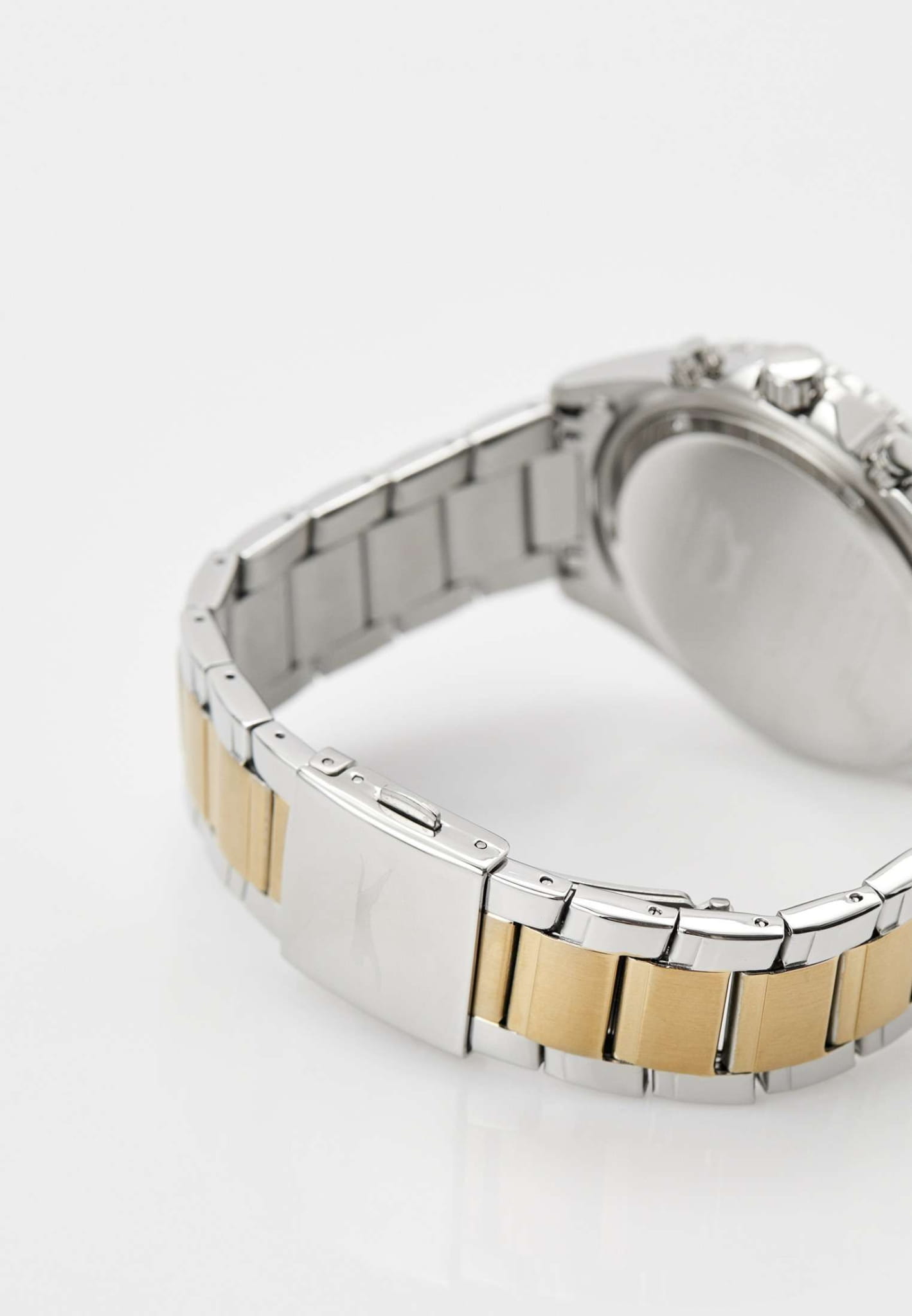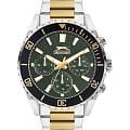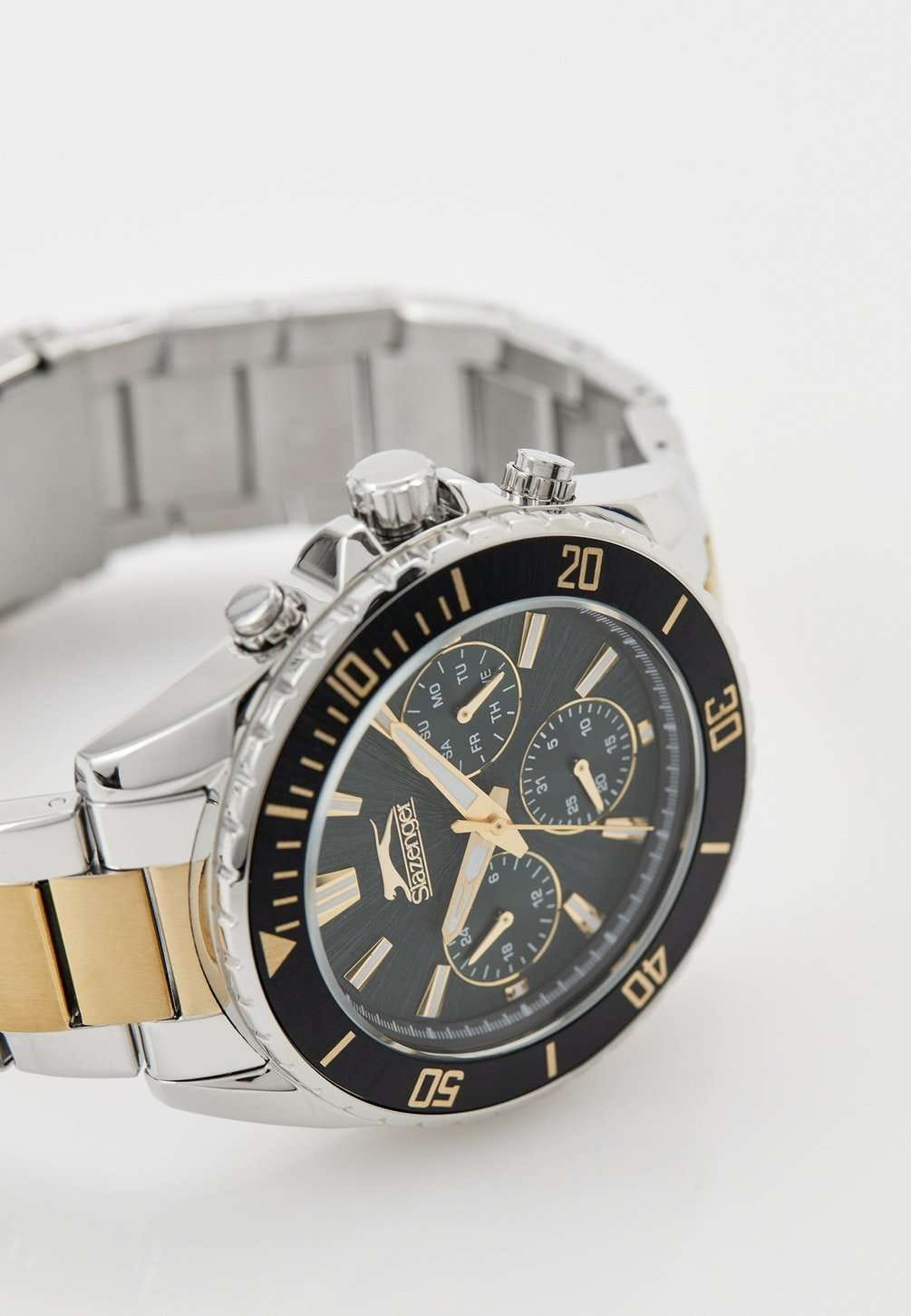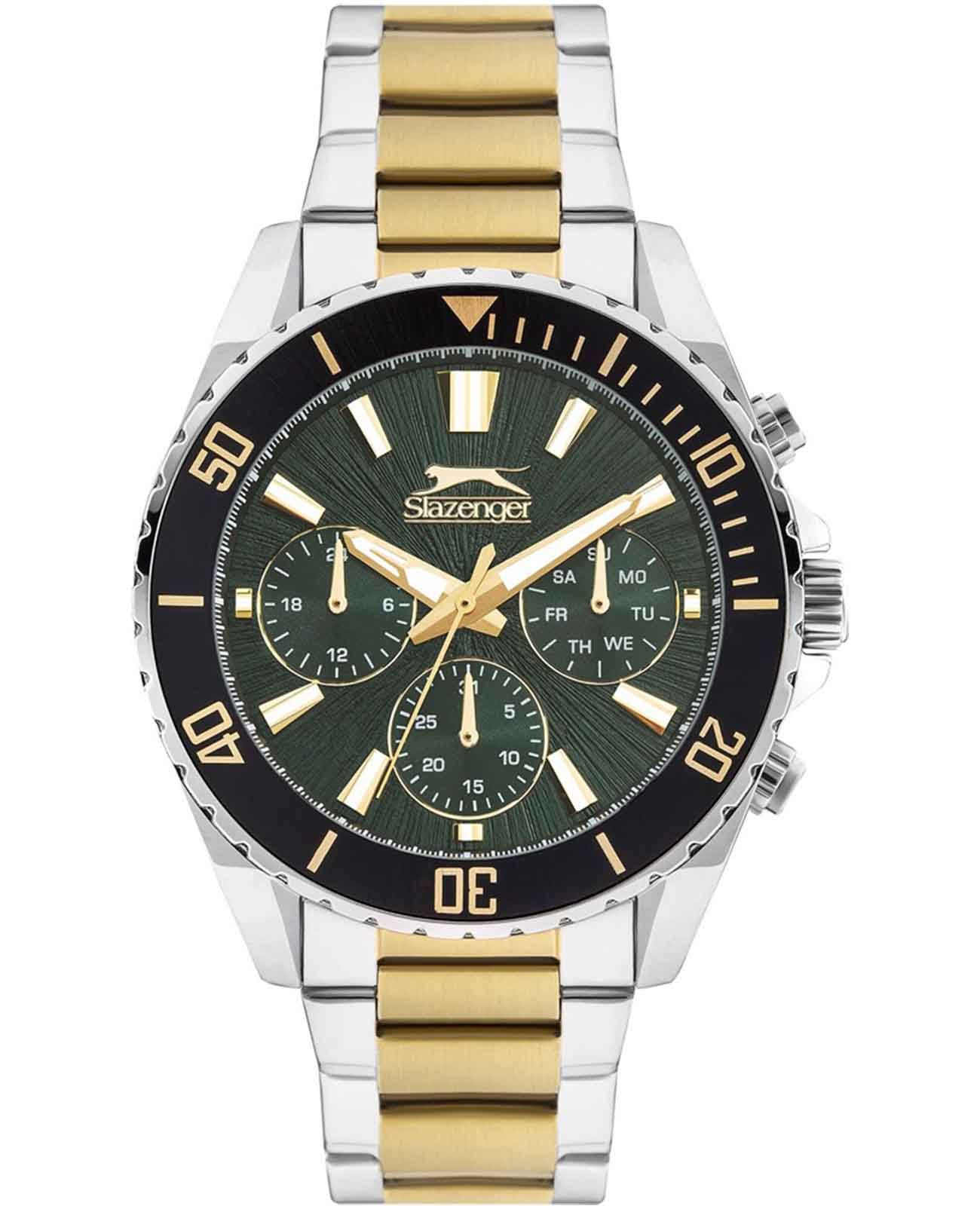 Часы Slazenger SL.09.2273.2.05 – стильный и функциональный аксессуар, который станет достойным дополнением к вашему образу. Модель оснащена надежным кварцевым механизмом, заключенным в корпус из инновационного суперметалла – прочного сплава на основе меди с пониженным содержанием цинка и никеля и специальным покрытием, устойчивым к износу. На безельБезельВнешний ободок, закрепляющий стекло. В спортивных часах так называется поворотное кольцо с делениями на циферблате, выполняет роль таймера – замеряет отрезки времени на шкале. Неподвижный безель – элемент декора. Однонаправленно вращающийся безель на дайверских часах позволяет фиксировать моменты погружения и выныривания на поверхность. нанесено черное IP-покрытиеIP-покрытиеМетод ионного напыления. Демонстрирует повышенную устойчивость к истиранию, окислению и химическим веществам. Под воздействием высокого давления и температуры около 1500°C молекулы металла надёжно соединяются с частицами корпуса часов., что придает аксессуару утончённый и универсальный внешний вид. Зеленый циферблат под минеральным стекломМинеральное стеклоМинеральное стекло представляет собой искусственно выращенный минерал кварца. Такое стекло отличается особой устойчивостью к повреждениям и царапинам. Уступает по некоторым качествам сапфировому стеклу. дополнен отдельными счетчиками: 24-часовой указатель времени, индикаторы даты и дня недели. Диаметр корпуса составляет 44 мм, а толщина – 12 мм, что обеспечивает комфортную посадку на запястье и подчёркивает современный стиль часов. Браслет из суперметалла с частичным золотистым  IP-покрытиемIP-покрытиеМетод ионного напыления. Демонстрирует повышенную устойчивость к истиранию, окислению и химическим веществам. Под воздействием высокого давления и температуры около 1500°C молекулы металла надёжно соединяются с частицами корпуса часов. и с раскладной застёжкойРаскладная застёжкаТакой тип застёжки используется только на браслетах из металла. Она никогда не раскрывается полностью, происходит разделение на 2 и более частей. Раскладывающая застёжка снизит вероятность потери часов к минимуму. обеспечивает комфортную посадку. Стрелки и метки с люминесцентным покрытиемЛюминесцентное покрытиеПозволяет считывать показания времени в темноте. Производители наносят на стрелки, часовые индексы, безель или поверхность циферблата светонакопительный состав, дающий холодное свечение. удобно подсвечиваются в темноте после зарядки на свету. Водонепроницаемость 5 АТМ защищает механизм от брызг и дождя, позволяя не беспокоиться о сохранности аксессуара в повседневной жизни. Эта модель станет отличным выбором для ежедневного ношения или особых случаев и прекрасным подарком для мужчины к любому празднику.