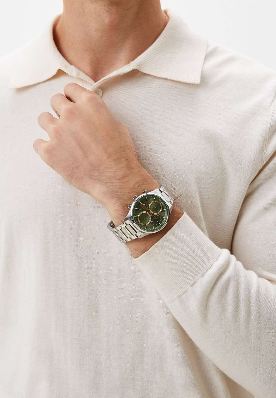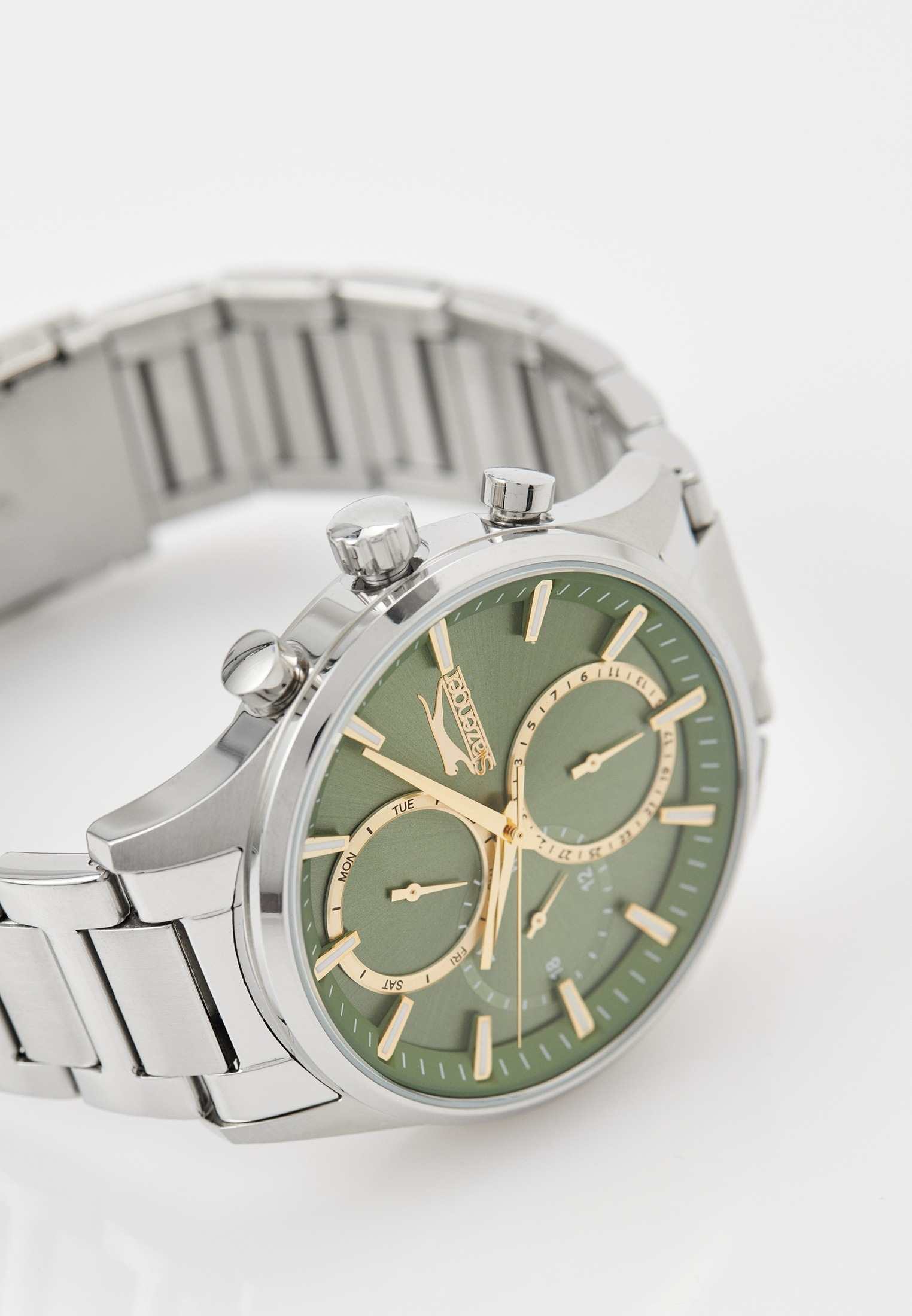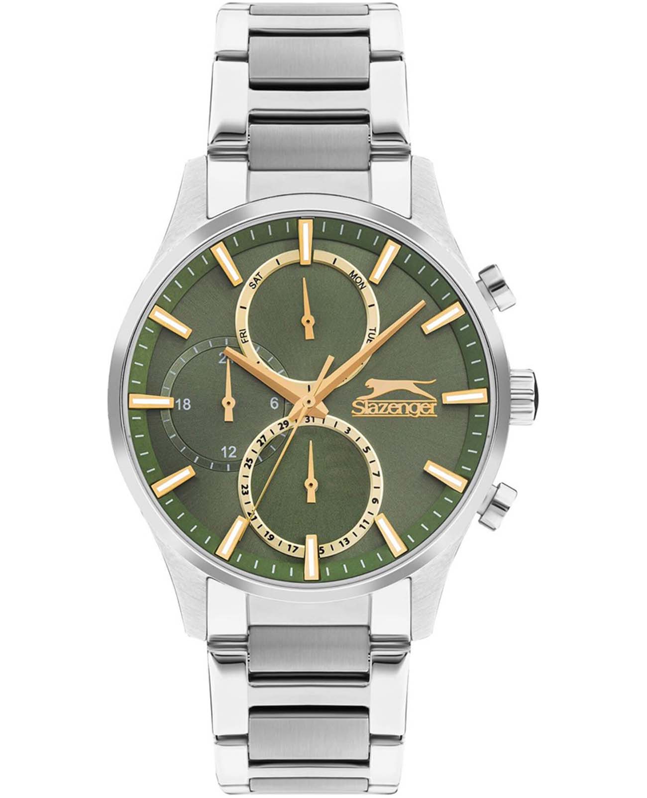 Часы Slazenger SL.09.2283.2.03 — это стильный и надежный аксессуар, который подчеркивает индивидуальность своего владельца. Корпус и браслет выполнены из прочного суперметалла — инновационного сплава на основе меди с пониженным содержанием цинка и никеля, дополненного специальным покрытием для долговечности и эстетики. Зеленый циферблат надежно защищен минеральным стекломМинеральное стеклоМинеральное стекло представляет собой искусственно выращенный минерал кварца. Такое стекло отличается особой устойчивостью к повреждениям и царапинам. Уступает по некоторым качествам сапфировому стеклу., устойчивым к царапинам и механическим повреждениям. Модель оснащена кварцевым механизмом, что гарантирует высокую точность хода. На отдельные циферблаты вынесены указатели 24-часового времени, даты и дня недели, что делает использование часов особенно удобным в повседневной жизни. Стальной браслет с раскладной застёжкойРаскладная застёжкаТакой тип застёжки используется только на браслетах из металла. Она никогда не раскрывается полностью, происходит разделение на 2 и более частей. Раскладывающая застёжка снизит вероятность потери часов к минимуму. обеспечивает комфортную посадку. Водозащита 5 АТМ позволяет не беспокоиться о случайных брызгах или дожде. Метки с люминесцентным покрытиемЛюминесцентное покрытиеПозволяет считывать показания времени в темноте. Производители наносят на стрелки, часовые индексы, безель или поверхность циферблата светонакопительный состав, дающий холодное свечение. удобно подсвечиваются в темноте после зарядки на свету. Диаметр корпуса составляет 43 мм, толщина — 13 мм, что обеспечивает комфортное ношение на запястье. Часы станут отличным выбором для повседневного использования или дополнения к деловому образу, а также послужат отличным подарком на любой праздник.