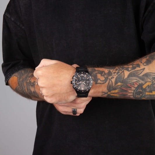 Часы Slazenger SL.09.2285.2.05 — это стильное решение для тех, кто ценит сочетание выразительного дизайна и функциональности. Модель оснащена надежным кварцевым механизмом, который заключен в прочный корпус диаметром 45 мм и толщиной 13 мм, выполненный из суперметалла с черным IP-покрытиемIP-покрытиеМетод ионного напыления. Демонстрирует повышенную устойчивость к истиранию, окислению и химическим веществам. Под воздействием высокого давления и температуры около 1500°C молекулы металла надёжно соединяются с частицами корпуса часов. — современного сплава на основе меди с пониженным содержанием цинка и никеля, обладающего высокой прочностью и устойчивостью к износу, а на безельБезельВнешний ободок, закрепляющий стекло. В спортивных часах так называется поворотное кольцо с делениями на циферблате, выполняет роль таймера – замеряет отрезки времени на шкале. Неподвижный безель – элемент декора. Однонаправленно вращающийся безель на дайверских часах позволяет фиксировать моменты погружения и выныривания на поверхность. нанесено черное IP-покрытиеIP-покрытиеМетод ионного напыления. Демонстрирует повышенную устойчивость к истиранию, окислению и химическим веществам. Под воздействием высокого давления и температуры около 1500°C молекулы металла надёжно соединяются с частицами корпуса часов. и секундная шкала. Минеральное стеклоМинеральное стеклоМинеральное стекло представляет собой искусственно выращенный минерал кварца. Такое стекло отличается особой устойчивостью к повреждениям и царапинам. Уступает по некоторым качествам сапфировому стеклу. защищает черный циферблат от царапин и повреждений. Часы оснащены дополнительными циферблатами для отображения 24-часового времени, даты и дня недели, что делает использование еще более удобным. Браслет также выполнен из суперметалла с черным IP-покрытиемIP-покрытиеМетод ионного напыления. Демонстрирует повышенную устойчивость к истиранию, окислению и химическим веществам. Под воздействием высокого давления и температуры около 1500°C молекулы металла надёжно соединяются с частицами корпуса часов. и с раскладной застёжкойРаскладная застёжкаТакой тип застёжки используется только на браслетах из металла. Она никогда не раскрывается полностью, происходит разделение на 2 и более частей. Раскладывающая застёжка снизит вероятность потери часов к минимуму. и гармонично дополняет общий облик аксессуара. Циферблат оснащён люминесцентным покрытиемЛюминесцентное покрытиеПозволяет считывать показания времени в темноте. Производители наносят на стрелки, часовые индексы, безель или поверхность циферблата светонакопительный состав, дающий холодное свечение. стрелок и меток, что позволяет легко определять время даже в условиях плохой освещенности. Класс водозащиты 5 АТМ позволяет не бояться случайных брызг и дождя, а гарантия 12 месяцев подтверждает высокое качество изделия.