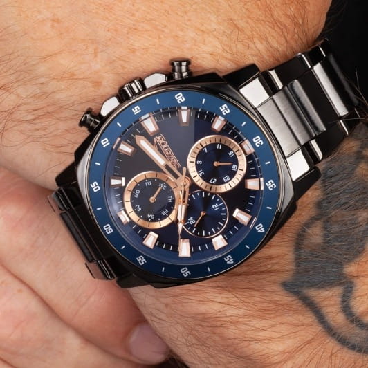 Slazenger SL.09.2292.2.04 — это стильные наручные часы, выполненные в современном дизайне и отлично подходящие для повседневного использования. Корпус диаметром 45 мм изготовлен из прочного металла с черным IP-покрытиемIP-покрытиеМетод ионного напыления. Демонстрирует повышенную устойчивость к истиранию, окислению и химическим веществам. Под воздействием высокого давления и температуры около 1500°C молекулы металла надёжно соединяются с частицами корпуса часов. и дополнен минеральным стекломМинеральное стеклоМинеральное стекло представляет собой искусственно выращенный минерал кварца. Такое стекло отличается особой устойчивостью к повреждениям и царапинам. Уступает по некоторым качествам сапфировому стеклу., которое защищает синий циферблат. Черный металлический браслет с IP-покрытиемIP-покрытиеМетод ионного напыления. Демонстрирует повышенную устойчивость к истиранию, окислению и химическим веществам. Под воздействием высокого давления и температуры около 1500°C молекулы металла надёжно соединяются с частицами корпуса часов. шириной 24 мм оснащён надежной раскладной застёжкойРаскладная застёжкаТакой тип застёжки используется только на браслетах из металла. Она никогда не раскрывается полностью, происходит разделение на 2 и более частей. Раскладывающая застёжка снизит вероятность потери часов к минимуму., которая обеспечивает комфортную посадку на руке. Кварцевый механизм гарантирует точный ход, а водозащита уровня WR 50 позволяет не снимать часы во время мытья рук или под дождём. Модель оснащена люминесцентным покрытиемЛюминесцентное покрытиеПозволяет считывать показания времени в темноте. Производители наносят на стрелки, часовые индексы, безель или поверхность циферблата светонакопительный состав, дающий холодное свечение. стрелок и меток, что облегчает считывание времени в темноте. Дополнительные малые циферблаты отображают дату, день недели и текущее время в 24-часовом формате. Часы также оснащены заводной головкой с защитой и безелемБезельВнешний ободок, закрепляющий стекло. В спортивных часах так называется поворотное кольцо с делениями на циферблате, выполняет роль таймера – замеряет отрезки времени на шкале. Неподвижный безель – элемент декора. Однонаправленно вращающийся безель на дайверских часах позволяет фиксировать моменты погружения и выныривания на поверхность. с синим IP-покрытиемIP-покрытиеМетод ионного напыления. Демонстрирует повышенную устойчивость к истиранию, окислению и химическим веществам. Под воздействием высокого давления и температуры около 1500°C молекулы металла надёжно соединяются с частицами корпуса часов. и секундной разметкой. Вес изделия составляет 173 грамма.