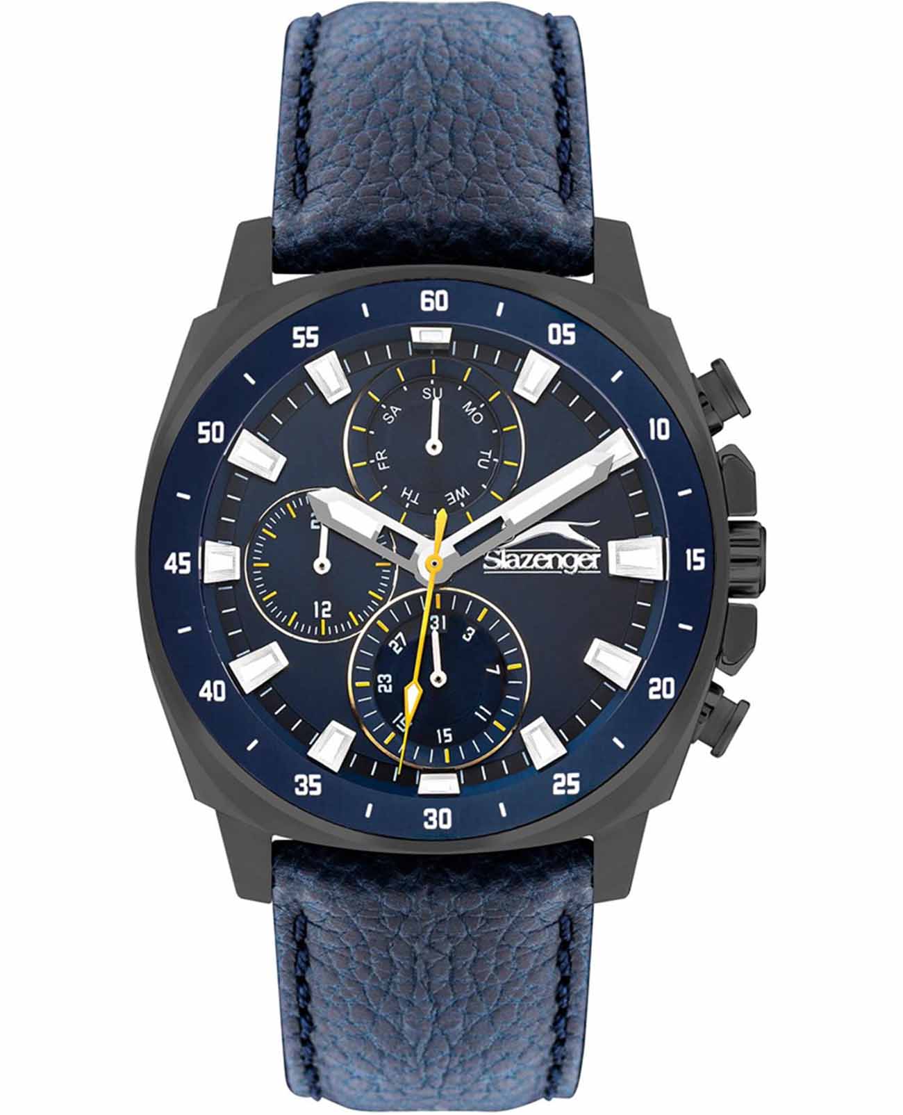 Slazenger SL.09.2293.2.03 — это стильные наручные часы, выполненные в современном дизайне и отлично подходящие для повседневного использования. Корпус диаметром 45 мм изготовлен из прочного металла с черным IP-покрытиемIP-покрытиеМетод ионного напыления. Демонстрирует повышенную устойчивость к истиранию, окислению и химическим веществам. Под воздействием высокого давления и температуры около 1500°C молекулы металла надёжно соединяются с частицами корпуса часов. и дополнен минеральным стекломМинеральное стеклоМинеральное стекло представляет собой искусственно выращенный минерал кварца. Такое стекло отличается особой устойчивостью к повреждениям и царапинам. Уступает по некоторым качествам сапфировому стеклу., которое защищает синий циферблат. Синий кожаный ремешок шириной 24 мм оснащён надежной классической застежкой, которая обеспечивает комфортную посадку на руке. Кварцевый механизм гарантирует точный ход, а водозащита уровня WR 50 позволяет не снимать часы во время мытья рук или под дождём. Модель оснащена люминесцентным покрытиемЛюминесцентное покрытиеПозволяет считывать показания времени в темноте. Производители наносят на стрелки, часовые индексы, безель или поверхность циферблата светонакопительный состав, дающий холодное свечение. стрелок и меток, что облегчает считывание времени в темноте. Дополнительные малые циферблаты отображают дату, день недели и текущее время в 24-часовом формате. Часы также оснащены заводной головкой с защитой и безелемБезельВнешний ободок, закрепляющий стекло. В спортивных часах так называется поворотное кольцо с делениями на циферблате, выполняет роль таймера – замеряет отрезки времени на шкале. Неподвижный безель – элемент декора. Однонаправленно вращающийся безель на дайверских часах позволяет фиксировать моменты погружения и выныривания на поверхность. с синим IP-покрытиемIP-покрытиеМетод ионного напыления. Демонстрирует повышенную устойчивость к истиранию, окислению и химическим веществам. Под воздействием высокого давления и температуры около 1500°C молекулы металла надёжно соединяются с частицами корпуса часов. и секундной разметкой. Вес изделия составляет 80 грамм.