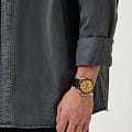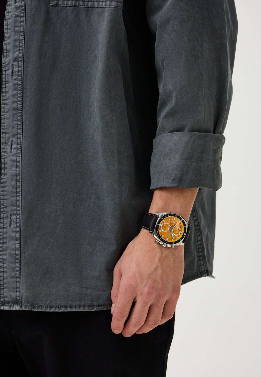 Slazenger SL.09.2293.2.05 — это стильные наручные часы, выполненные в современном дизайне и отлично подходящие для повседневного использования. Корпус диаметром 45 мм изготовлен из прочного металла и дополнен минеральным стекломМинеральное стеклоМинеральное стекло представляет собой искусственно выращенный минерал кварца. Такое стекло отличается особой устойчивостью к повреждениям и царапинам. Уступает по некоторым качествам сапфировому стеклу., которое защищает желтый циферблат. Черный кожаный ремешок шириной 24 мм оснащён надежной классической застежкой, которая обеспечивает комфортную посадку на руке. Кварцевый механизм гарантирует точный ход, а водозащита уровня WR 50 позволяет не снимать часы во время мытья рук или под дождём. Модель оснащена люминесцентным покрытиемЛюминесцентное покрытиеПозволяет считывать показания времени в темноте. Производители наносят на стрелки, часовые индексы, безель или поверхность циферблата светонакопительный состав, дающий холодное свечение. стрелок и меток, что облегчает считывание времени в темноте. Дополнительные малые циферблаты отображают дату, день недели и текущее время в 24-часовом формате. Часы также оснащены заводной головкой с защитой и безелемБезельВнешний ободок, закрепляющий стекло. В спортивных часах так называется поворотное кольцо с делениями на циферблате, выполняет роль таймера – замеряет отрезки времени на шкале. Неподвижный безель – элемент декора. Однонаправленно вращающийся безель на дайверских часах позволяет фиксировать моменты погружения и выныривания на поверхность. с черным IP-покрытиемIP-покрытиеМетод ионного напыления. Демонстрирует повышенную устойчивость к истиранию, окислению и химическим веществам. Под воздействием высокого давления и температуры около 1500°C молекулы металла надёжно соединяются с частицами корпуса часов. и секундной разметкой. Вес изделия составляет 80 грамм.