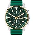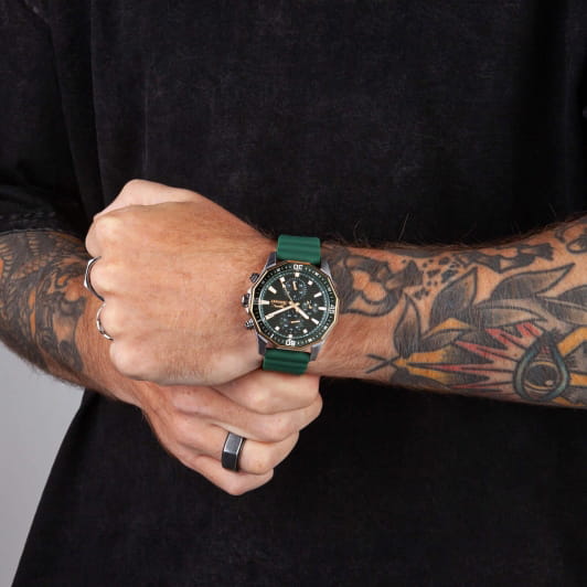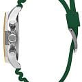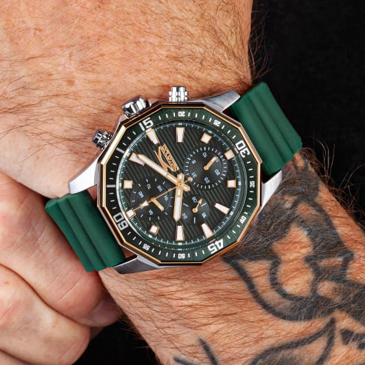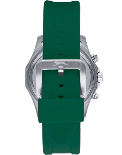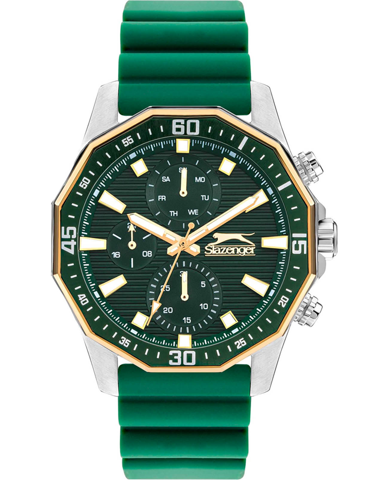 Мужские кварцевые часы Slazenger SL.09.2298.2.07 — это выразительный и функциональный аксессуар, сочетающий прочность, стиль и насыщенную комплектацию. Корпус выполнен из суперметалла с PVD-покрытиемPVDУльтратонкое покрытие наносится в технике вакуумного напыления, сочетает в себе нитрид титана особой прочности со слоем золота или оксида хрома. Несёт в себе декоративную или защитную функцию., а лицевая часть защищена минеральным стекломМинеральное стеклоМинеральное стекло представляет собой искусственно выращенный минерал кварца. Такое стекло отличается особой устойчивостью к повреждениям и царапинам. Уступает по некоторым качествам сапфировому стеклу.. Циферблат зелёного цвета оформлен с вынесенными малыми циферблатами для индикации дня недели, даты и 24-часового формата времени. Стрелки и метки покрыты люминесцентным покрытиемЛюминесцентное покрытиеПозволяет считывать показания времени в темноте. Производители наносят на стрелки, часовые индексы, безель или поверхность циферблата светонакопительный состав, дающий холодное свечение., что обеспечивает хорошую читаемость в темноте. Заводная головка снабжена защитой, а задняя крышка — завинчивающаяся, что повышает надёжность конструкции. Часы оснащены силиконовым ремешком зелёного цвета, фиксирующимся на стандартной застёжке. Водонепроницаемость 50 м позволяет использовать часы в повседневных условиях, защищая от случайных брызг и капель дождя. Модель подчёркивает индивидуальность владельца и идеально подходит как для повседневного, так и для спортивного образа.