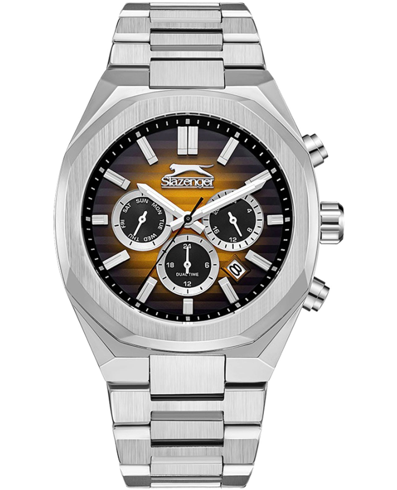 Мужские кварцевые часы Slazenger SL.09.2345.2.03 – идеальное сочетание классического дизайна и современных технологий, созданное для уверенных в себе мужчин. Корпус выполнен из суперметалла серебристого цвета, диаметром 43 мм и толщиной 12 мм, подчёркивает надежность модели и делает их идеальным аксессуаром для любой ситуации – будь то деловая встреча или повседневные выходы. Циферблат надёжно защищён минеральным стекломМинеральное стеклоМинеральное стекло представляет собой искусственно выращенный минерал кварца. Такое стекло отличается особой устойчивостью к повреждениям и царапинам. Уступает по некоторым качествам сапфировому стеклу., которое устойчиво к механическим повреждениям и сохраняет кристальную прозрачность. Браслет из суперметалла удобно облегает запястье и фиксируется с помощью раскладной застёжкиРаскладная застёжкаТакой тип застёжки используется только на браслетах из металла. Она никогда не раскрывается полностью, происходит разделение на 2 и более частей. Раскладывающая застёжка снизит вероятность потери часов к минимуму., обеспечивая надёжность и комфорт в повседневном ношении. Стрелки и метки покрыты люминесцентным покрытиемЛюминесцентное покрытиеПозволяет считывать показания времени в темноте. Производители наносят на стрелки, часовые индексы, безель или поверхность циферблата светонакопительный состав, дающий холодное свечение., обеспечивающим отличную читаемость в темноте. Эти часы станут не просто аксессуаром, а надежным спутником в любой ситуации, подчеркивая ваш безупречный вкус и деловой стиль. Окошко даты находится в положении между 4 и 5 часов. Вынесенный циферблат с 24-х часовым указателем времени. Водозащита до 50 метров позволит защитить корпус от случайных брызг или капель дождя. Функция GMTGMTОтображение времени второго часового пояса.Такая функция особенно актуальна для путешественников и бизнесменов,которые общаются с людьми из разных стран,теперь вы всегда будете знать,какой час у вашего партнёра или близкого человека. поможет отслеживать время второго часового поясаВторой часовой поясФункция, позволяющая отображать время двух часовых поясов одновременно..