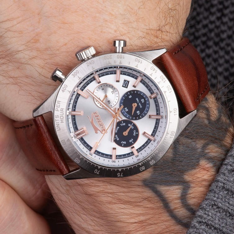 Мужские кварцевые часы Slazenger SL.09.2359.2.04 – идеальное сочетание классического дизайна и современных технологий, созданное для уверенных в себе мужчин. Корпус выполнен из суперметалла серебристого цвета, диаметром 43 мм и толщиной 11 мм, подчёркивает надежность модели и делает их идеальным аксессуаром для любой ситуации – будь то деловая встреча или повседневные выходы. Циферблат надёжно защищён минеральным стекломМинеральное стеклоМинеральное стекло представляет собой искусственно выращенный минерал кварца. Такое стекло отличается особой устойчивостью к повреждениям и царапинам. Уступает по некоторым качествам сапфировому стеклу., которое устойчиво к механическим повреждениям и сохраняет кристальную прозрачность. Кожаный ремешок на стандартной застёжке удобно облегает запястье, обеспечивая надёжность и комфорт в повседневном ношении. Стрелки покрыты люминесцентным покрытиемЛюминесцентное покрытиеПозволяет считывать показания времени в темноте. Производители наносят на стрелки, часовые индексы, безель или поверхность циферблата светонакопительный состав, дающий холодное свечение., обеспечивающим отличную читаемость в темноте. Эти часы станут не просто аксессуаром, а надежным спутником в любой ситуации, подчеркивая ваш безупречный вкус и деловой стиль. Вынесенный циферблат с 24-х часовым указателем времени и функция тахиметраТахиметрРазмеченная шкала, располагается на ободке или безеле часов. Тахиметр позволяет рассчитать скорость на определённом участке пути, расстояние измеряется в километрах или милях.. Водозащита 50 метров позволит защитить корпус от случайных брызг или капель дождя.