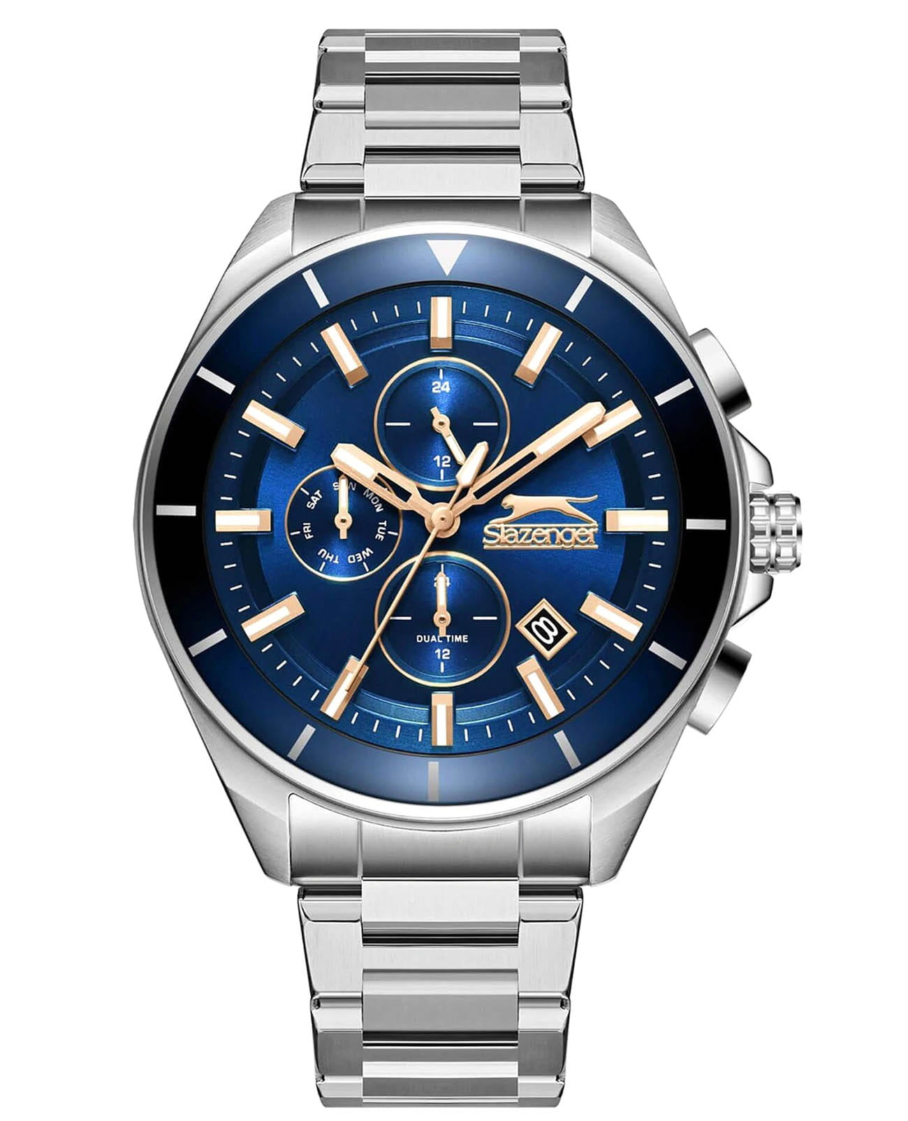 Мужские кварцевые часы Slazenger - это выразительный и функциональный аксессуар. Корпус диаметром 44 мм и толщиной 13 мм выполнен из нержавеющей стали 316L. Циферблат синего цвета оформлен индексами и стрелками. Циферблат защищён минеральным стекломМинеральное стеклоМинеральное стекло представляет собой искусственно выращенный минерал кварца. Такое стекло отличается особой устойчивостью к повреждениям и царапинам. Уступает по некоторым качествам сапфировому стеклу.. Механизм — кварцевый калибр JP1500Y. Часы оснащены индикацией дня недели, даты, 12/24-часового формата времени и функцией второго часового пояса (GMT)Второй часовой поясФункция, позволяющая отображать время двух часовых поясов одновременно.. Окошко даты расположено в положении 6 часов. Часы оснащены стальным браслетом с раскладной застёжкойРаскладная застёжкаТакой тип застёжки используется только на браслетах из металла. Она никогда не раскрывается полностью, происходит разделение на 2 и более частей. Раскладывающая застёжка снизит вероятность потери часов к минимуму.. Водонепроницаемость 100 м позволяет использовать часы для плавания и повседневного ношения. Гарантия — 12 месяцев. Идеальный выбор для тех, кто ценит стиль, функциональность и качество.