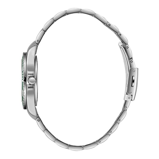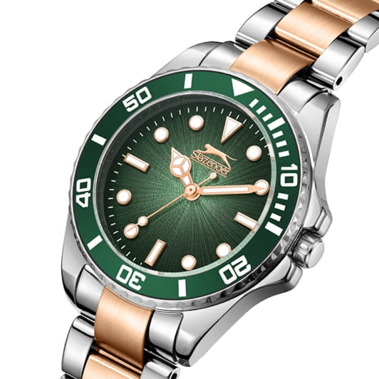 Женские кварцевые часы Slazenger — это элегантный аксессуар. Корпус диаметром 33 мм и толщиной 9 мм выполнен из суперметалла. Безель с IP-покрытиемIP-покрытиеМетод ионного напыления. Демонстрирует повышенную устойчивость к истиранию, окислению и химическим веществам. Под воздействием высокого давления и температуры около 1500°C молекулы металла надёжно соединяются с частицами корпуса часов.. Циферблат зелёного цвета оформлен индексами и стрелками. Циферблат защищён минеральным стекломМинеральное стеклоМинеральное стекло представляет собой искусственно выращенный минерал кварца. Такое стекло отличается особой устойчивостью к повреждениям и царапинам. Уступает по некоторым качествам сапфировому стеклу.. Механизм — кварцевый. Стрелки и метки с люминесцентным покрытиемЛюминесцентное покрытиеПозволяет считывать показания времени в темноте. Производители наносят на стрелки, часовые индексы, безель или поверхность циферблата светонакопительный состав, дающий холодное свечение., обеспечивающим хорошую читаемость в темноте. Часы оснащены браслетом из суперметалла с IP-покрытиемIP-покрытиеМетод ионного напыления. Демонстрирует повышенную устойчивость к истиранию, окислению и химическим веществам. Под воздействием высокого давления и температуры около 1500°C молекулы металла надёжно соединяются с частицами корпуса часов. и раскладной застёжкойРаскладная застёжкаТакой тип застёжки используется только на браслетах из металла. Она никогда не раскрывается полностью, происходит разделение на 2 и более частей. Раскладывающая застёжка снизит вероятность потери часов к минимуму.. Водонепроницаемость 50 м позволяет использовать часы в повседневных условиях. Гарантия — 12 месяцев. Идеальный выбор для тех, кто ценит стиль и качество.