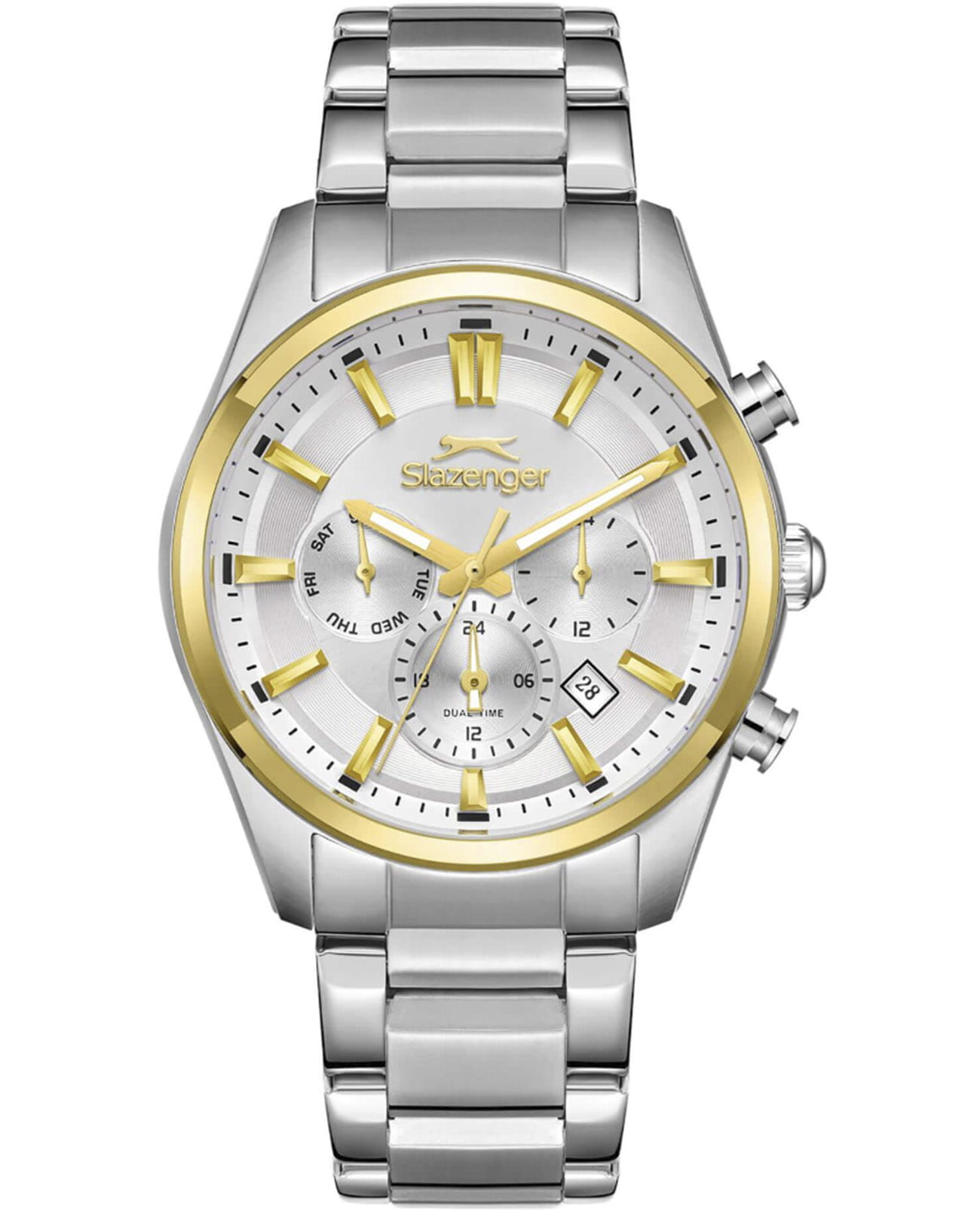 Мужские кварцевые часы Slazenger — это выразительный и функциональный аксессуар. Корпус диаметром 43 мм и толщиной 12 мм выполнен из нержавеющей стали 316L. Циферблат серебристого цвета оформлен индексами и стрелками с люминесцентным покрытиемЛюминесцентное покрытиеПозволяет считывать показания времени в темноте. Производители наносят на стрелки, часовые индексы, безель или поверхность циферблата светонакопительный состав, дающий холодное свечение., обеспечивающим хорошую читаемость в темноте. БезельБезельВнешний ободок, закрепляющий стекло. В спортивных часах так называется поворотное кольцо с делениями на циферблате, выполняет роль таймера – замеряет отрезки времени на шкале. Неподвижный безель – элемент декора. Однонаправленно вращающийся безель на дайверских часах позволяет фиксировать моменты погружения и выныривания на поверхность. из нержавеющей стали с PVD-покрытиемPVDУльтратонкое покрытие наносится в технике вакуумного напыления, сочетает в себе нитрид титана особой прочности со слоем золота или оксида хрома. Несёт в себе декоративную или защитную функцию.. Циферблат защищён минеральным стекломМинеральное стеклоМинеральное стекло представляет собой искусственно выращенный минерал кварца. Такое стекло отличается особой устойчивостью к повреждениям и царапинам. Уступает по некоторым качествам сапфировому стеклу.. Механизм — кварцевый калибр JP25. Часы оснащены индикацией дня недели, даты, 12/24-часового формата времени и функцией второго часового пояса (GMT)Второй часовой поясФункция, позволяющая отображать время двух часовых поясов одновременно.. Окошко даты расположено между 4 и 5 часами. Часы оснащены стальным браслетом из нержавеющей стали 316L с раскладной застёжкойРаскладная застёжкаТакой тип застёжки используется только на браслетах из металла. Она никогда не раскрывается полностью, происходит разделение на 2 и более частей. Раскладывающая застёжка снизит вероятность потери часов к минимуму.. Водонепроницаемость 100 м позволяет использовать часы для плавания и повседневного ношения. Гарантия — 12 месяцев. Идеальный выбор для тех, кто ценит стиль, функциональность и качество.