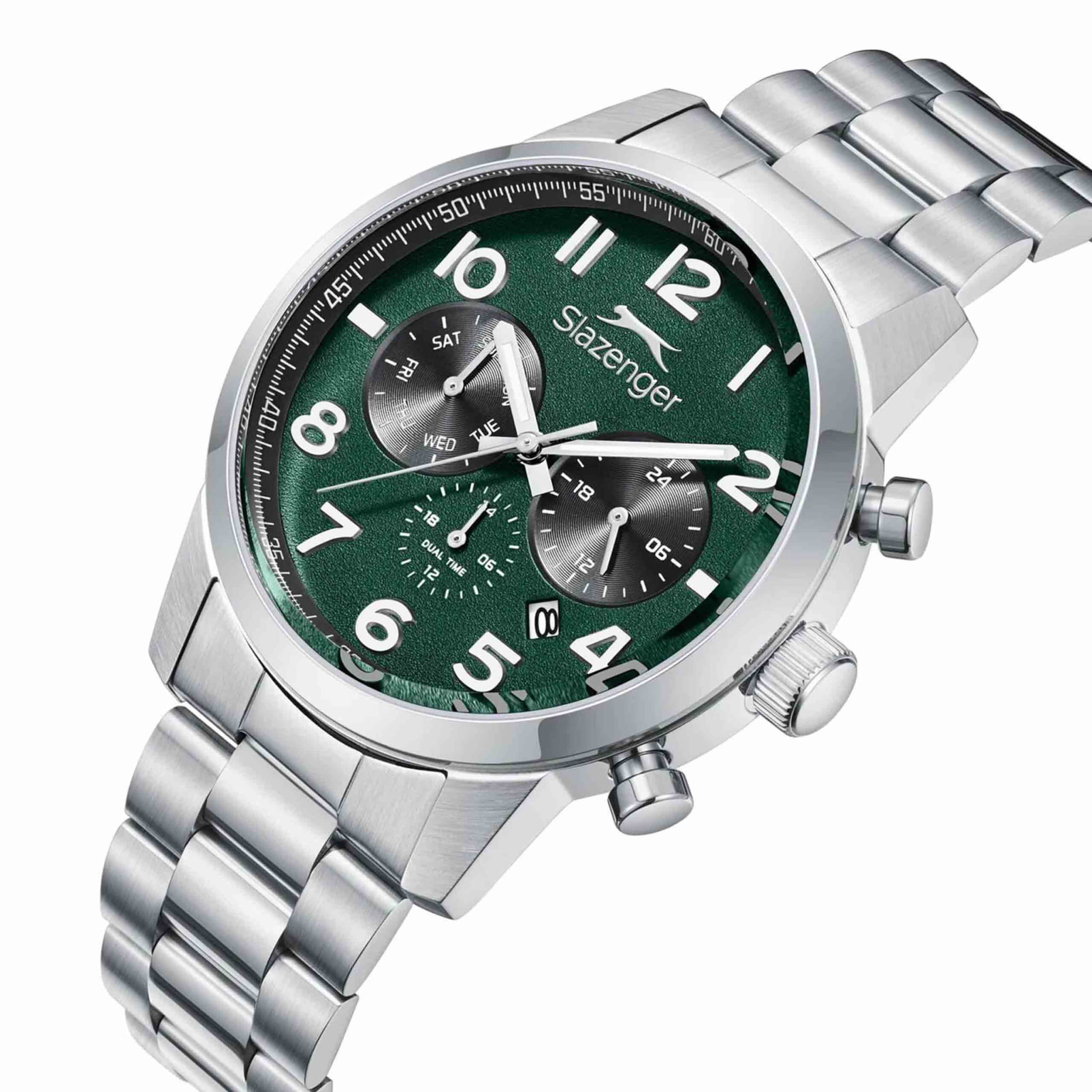 Мужские кварцевые часы Slazenger — это выразительный и функциональный аксессуар. Корпус диаметром 42 мм и толщиной 12 мм выполнен из нержавеющей стали 316L. Циферблат зелёного цвета оформлен индексами и стрелками. Окошко даты расположено на отметке в 6 часов. Указатель дня недели и 24-часовой формат времени вынесены на отдельные субциферблаты. Циферблат защищён минеральным стекломМинеральное стеклоМинеральное стекло представляет собой искусственно выращенный минерал кварца. Такое стекло отличается особой устойчивостью к повреждениям и царапинам. Уступает по некоторым качествам сапфировому стеклу.. Механизм — кварцевый калибр JP25. Часы оснащены функцией второго часового пояса (GMT)Второй часовой поясФункция, позволяющая отображать время двух часовых поясов одновременно.. Стрелки и метки с люминесцентным покрытиемЛюминесцентное покрытиеПозволяет считывать показания времени в темноте. Производители наносят на стрелки, часовые индексы, безель или поверхность циферблата светонакопительный состав, дающий холодное свечение., обеспечивающим хорошую читаемость в темноте. Часы оснащены стальным браслетом с раскладной застёжкойРаскладная застёжкаТакой тип застёжки используется только на браслетах из металла. Она никогда не раскрывается полностью, происходит разделение на 2 и более частей. Раскладывающая застёжка снизит вероятность потери часов к минимуму.. Водонепроницаемость 100 м позволяет использовать часы для плавания и повседневного ношения. Гарантия — 12 месяцев. Идеальный выбор для тех, кто ценит стиль, функциональность и качество.