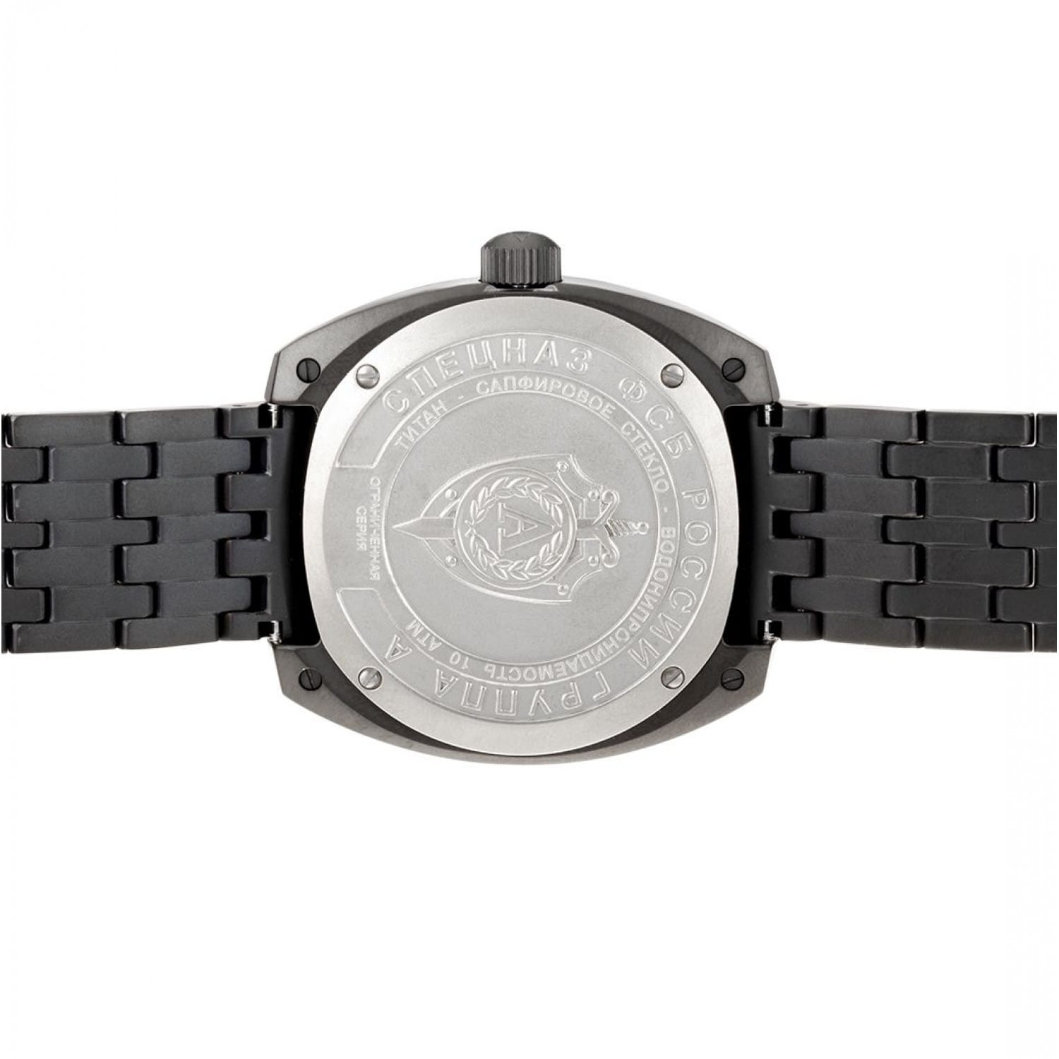 Часы Спецназ "Группа А" С9664418-8215 — коллекционная модель, созданная по заказу легендарного спецподразделения ФСБ «Группа А» («Альфа»). Корпус диаметром 45 мм выполнен из титана с PVD-покрытиемPVDУльтратонкое покрытие наносится в технике вакуумного напыления, сочетает в себе нитрид титана особой прочности со слоем золота или оксида хрома. Несёт в себе декоративную или защитную функцию. чёрного цвета, а черный циферблат защищён сапфировым стекломСапфировое стеклоПрочный и надёжный материал из кристалла сапфира синтетического происхождения, характеризующийся особой твёрдостью и устойчивостью к царапинам и повреждениям. с антибликовым покрытием.