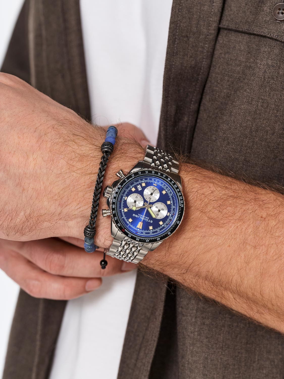 Stuhrling 1010.03 — мощные мужские часы с выразительным спортивным характером и динамичным дизайном. Корпус из нержавеющей стали гармонично сочетается с циферблатом, оформленным рельефным узором и контрастными счётчиками хронографаХронографФункция позволяет измерять отрезки времени с особой точностью: часы, минуты, секунды. Верным признаком хронографа является наличие на циферблате 3 дополнительных окошек-счётчиков.. Широкий безельБезельВнешний ободок, закрепляющий стекло. В спортивных часах так называется поворотное кольцо с делениями на циферблате, выполняет роль таймера – замеряет отрезки времени на шкале. Неподвижный безель – элемент декора. Однонаправленно вращающийся безель на дайверских часах позволяет фиксировать моменты погружения и выныривания на поверхность. с PVD-покрытиемPVDУльтратонкое покрытие наносится в технике вакуумного напыления, сочетает в себе нитрид титана особой прочности со слоем золота или оксида хрома. Несёт в себе декоративную или защитную функцию. подчёркивает брутальный стиль модели, а стрелки и метки с люминесцентным покрытиемЛюминесцентное покрытиеПозволяет считывать показания времени в темноте. Производители наносят на стрелки, часовые индексы, безель или поверхность циферблата светонакопительный состав, дающий холодное свечение. обеспечивают идеальную читаемость в любых условиях. Прочное стекло KrysternaKrysternaKrysterna — инновационное стекло для наручных часов. Благодаря уникальной структуре, Krysterna объединяет ключевые преимущества двух материалов: твердость сапфира, защищающую от царапин, и гибкость минерального стекла, обеспечивающую устойчивость к деформациям. Такая комбинация делает его идеальным решением для часов, подверженных экстремальным нагрузкам, сохраняя при этом оптическую прозрачность. устойчиво к царапинам, сохраняя прозрачность и блеск. Завершает образ стальной браслет с раскладной застёжкойРаскладная застёжкаТакой тип застёжки используется только на браслетах из металла. Она никогда не раскрывается полностью, происходит разделение на 2 и более частей. Раскладывающая застёжка снизит вероятность потери часов к минимуму., гарантирующий комфорт и надёжную фиксацию. Stuhrling — стильная и функциональная модель для уверенных мужчин, ценящих точность и энергию в каждой детали.