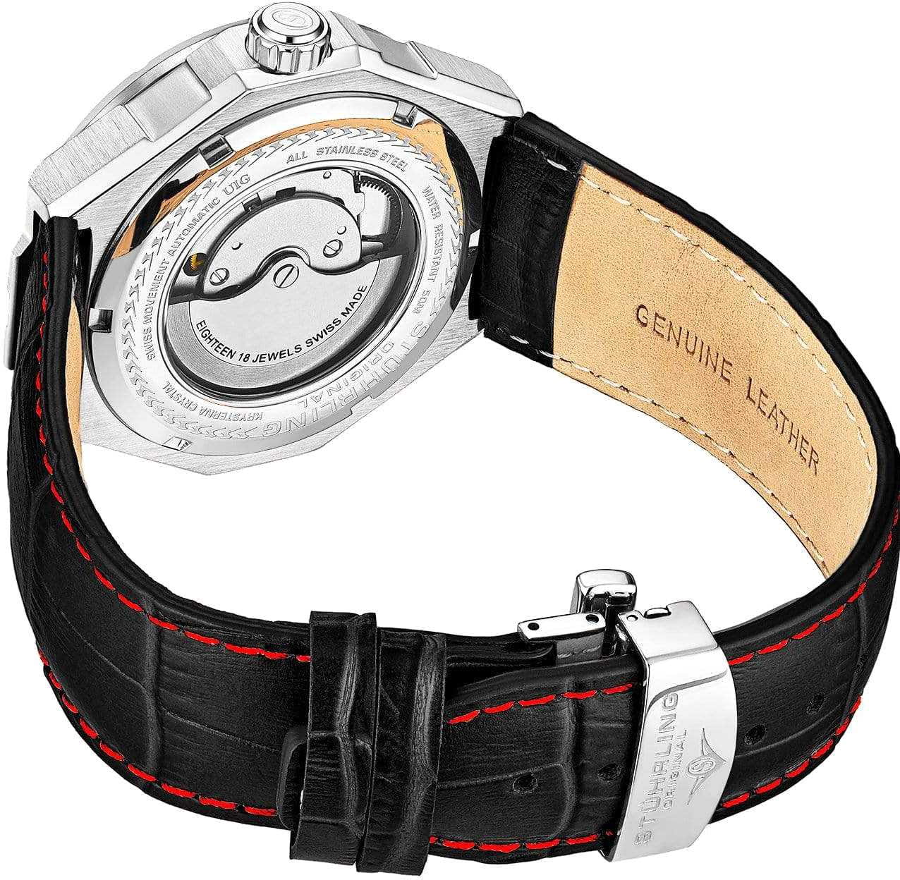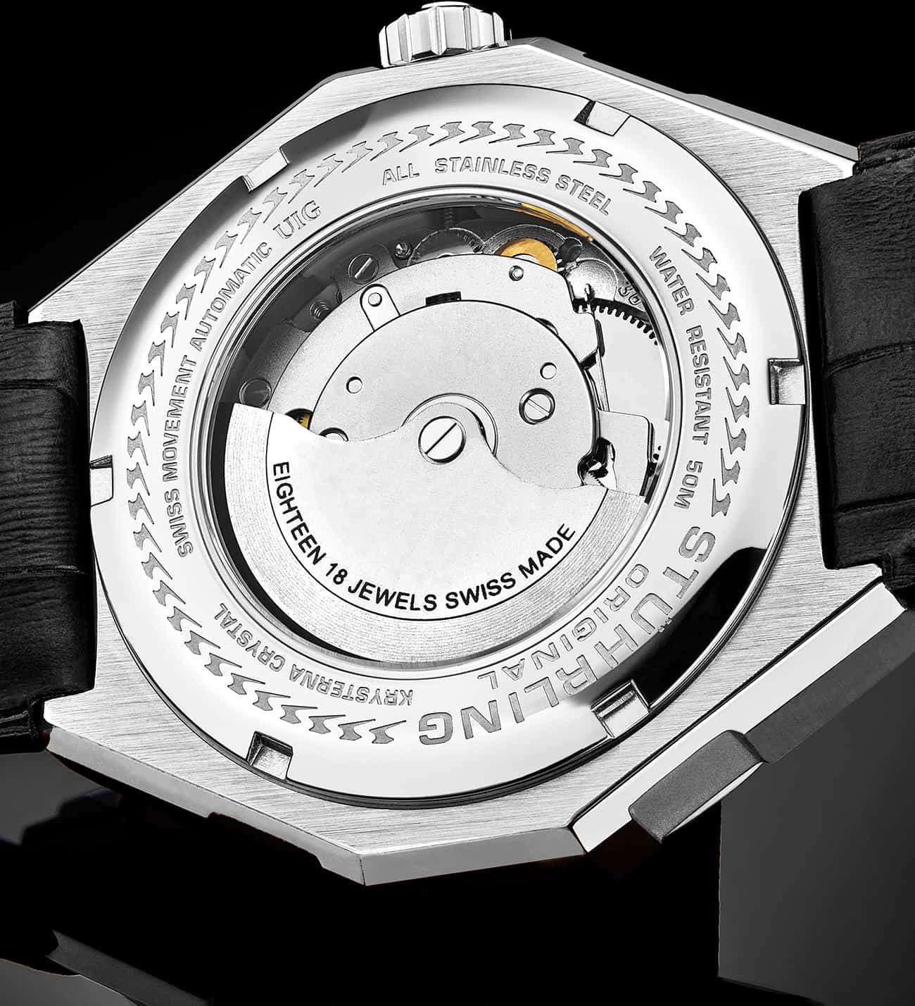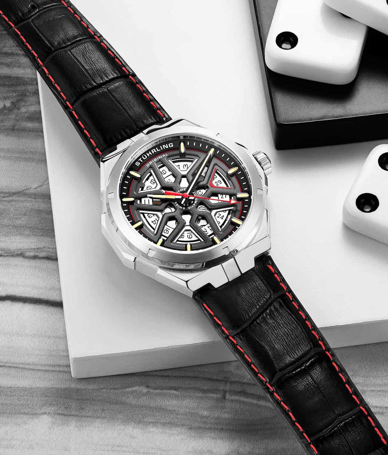 Stuhrling 379.01 — футуристические мужские часы, сочетающие смелый инженерный дизайн и надёжную механику. Архитектурный циферблат с многослойной структурой придаёт модели динамику и глубину. Стрелки и метки с люминесцентным покрытиемЛюминесцентное покрытиеПозволяет считывать показания времени в темноте. Производители наносят на стрелки, часовые индексы, безель или поверхность циферблата светонакопительный состав, дающий холодное свечение.. Корпус из нержавеющей стали выполнен с филигранной обработкой граней, подчёркивая технический характер часов. Прочное стекло KrysternaKrysternaKrysterna — инновационное стекло для наручных часов. Благодаря уникальной структуре, Krysterna объединяет ключевые преимущества двух материалов: твердость сапфира, защищающую от царапин, и гибкость минерального стекла, обеспечивающую устойчивость к деформациям. Такая комбинация делает его идеальным решением для часов, подверженных экстремальным нагрузкам, сохраняя при этом оптическую прозрачность. защищает сложную конструкцию от повреждений, сохраняя идеальную прозрачность. Кожаный ремень с контрастной строчкой и стандартной застежкой, обеспечивает комфорт и надёжную посадку. Stuhrling — выбор для тех, кто ценит оригинальность и технологичный стиль, где каждая деталь работает на впечатление.