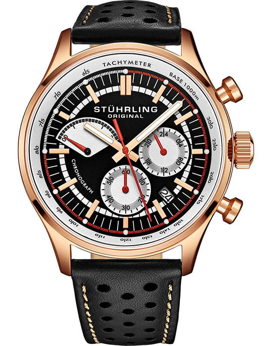 Stuhrling 934.03 — эффектные мужские часы в спортивно-классическом стиле, сочетающие энергичный характер и элегантное исполнение. Корпус с изысканным PVD-покрытиемPVDУльтратонкое покрытие наносится в технике вакуумного напыления, сочетает в себе нитрид титана особой прочности со слоем золота или оксида хрома. Несёт в себе декоративную или защитную функцию. цвета розового золота придаёт модели выразительность и статусный вид. Контрастный чёрный циферблат с белыми счётчиками хронографаХронографФункция позволяет измерять отрезки времени с особой точностью: часы, минуты, секунды. Верным признаком хронографа является наличие на циферблате 3 дополнительных окошек-счётчиков. и акцентами красного цвета создаёт динамичную композицию, а разметка тахиметра добавляет функциональности. Прочное стекло KrysternaKrysternaKrysterna — инновационное стекло для наручных часов. Благодаря уникальной структуре, Krysterna объединяет ключевые преимущества двух материалов: твердость сапфира, защищающую от царапин, и гибкость минерального стекла, обеспечивающую устойчивость к деформациям. Такая комбинация делает его идеальным решением для часов, подверженных экстремальным нагрузкам, сохраняя при этом оптическую прозрачность. защищает поверхность от царапин, сохраняя прозрачность и блеск. Перфорированный кожаный ремень со стандартной застежкой обеспечивает комфорт и спортивный характер образа. Stuhrling — выбор уверенного мужчины, для которого стиль, точность и мощная эстетика идут рука об руку.