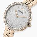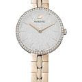 Сверкающий белый циферблат с изящными золотистыми метками и стрелками подчёркивает элегантность дизайна. Логотип Swarovski в виде лебедя расположен на отметке «12 часов».
