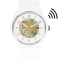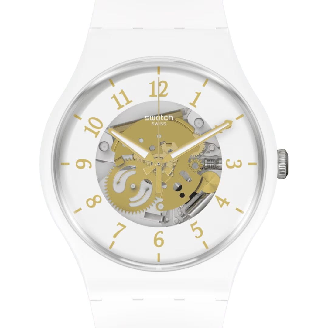 Часы Swatch New Gent Bioceramic Swatch Pay! SO32W105-5300 — это стильный и универсальный аксессуар, подходящий как для мужчин, так и для женщин. Часы поддерживают функцию бесконтактной оплаты SwatchPAY!. Модель отличается круглым корпусом диаметром 41 мм и толщиной 9 мм, выполненным из прочного пластика белого цвета. Циферблат прозрачный, с видимыми деталями механизма часов золотистого цвета. Стрелки с люминесцентным покрытиемЛюминесцентное покрытиеПозволяет считывать показания времени в темноте. Производители наносят на стрелки, часовые индексы, безель или поверхность циферблата светонакопительный состав, дающий холодное свечение.. Часы оснащены кварцевым механизмом, обеспечивающим точное измерение времени. Стекло из плексигласа защищает циферблат от царапин и повреждений. Ремешок выполнен из биоматериала, что обеспечивает комфорт при носке. Водонепроницаемость 3 бар позволяет не беспокоиться о случайных брызгах или кратковременном погружении в воду. Модель SO32P103-5300 не имеет функции отображения даты, что придает циферблату минималистичный и чистый вид. Эти часы станут ярким акцентом в любом образе. Они идеально подойдут как для повседневной носки, так и для особых случаев, привлекая внимание своим необычным цветовым решением и современным дизайном.