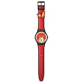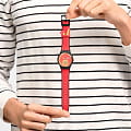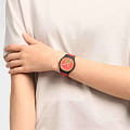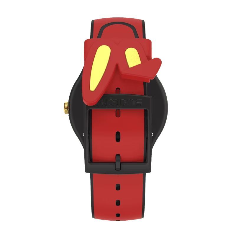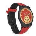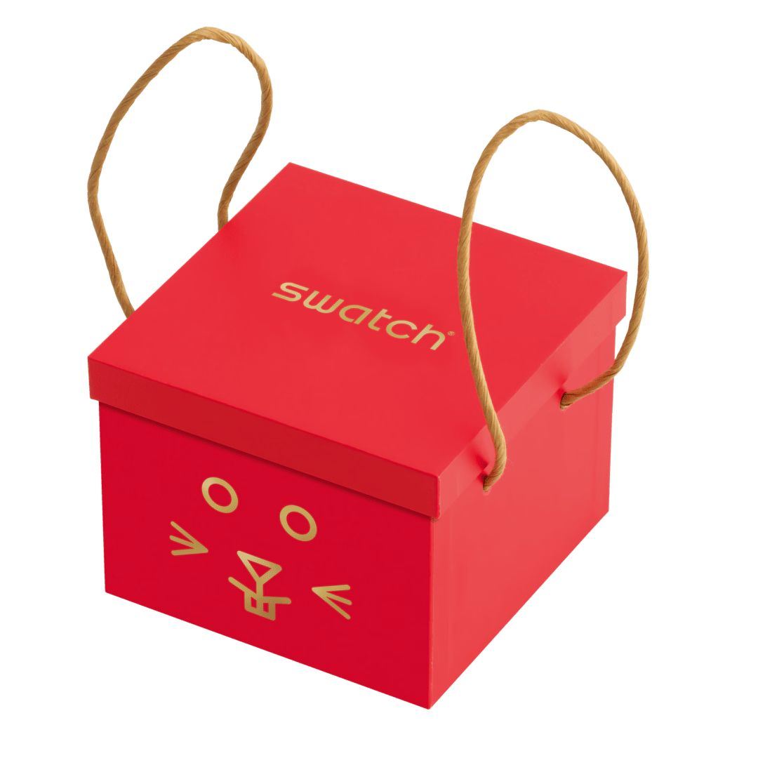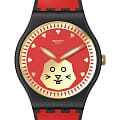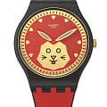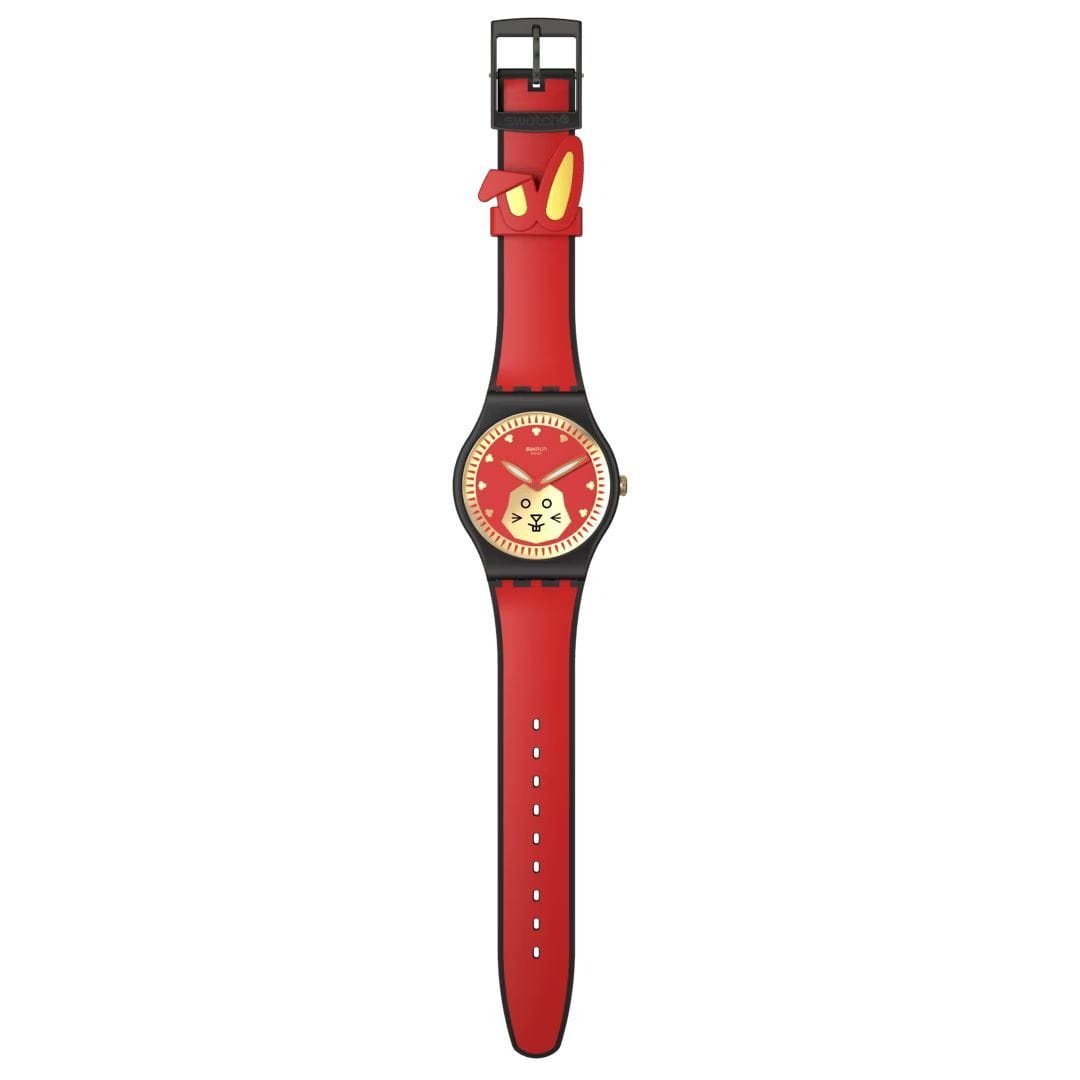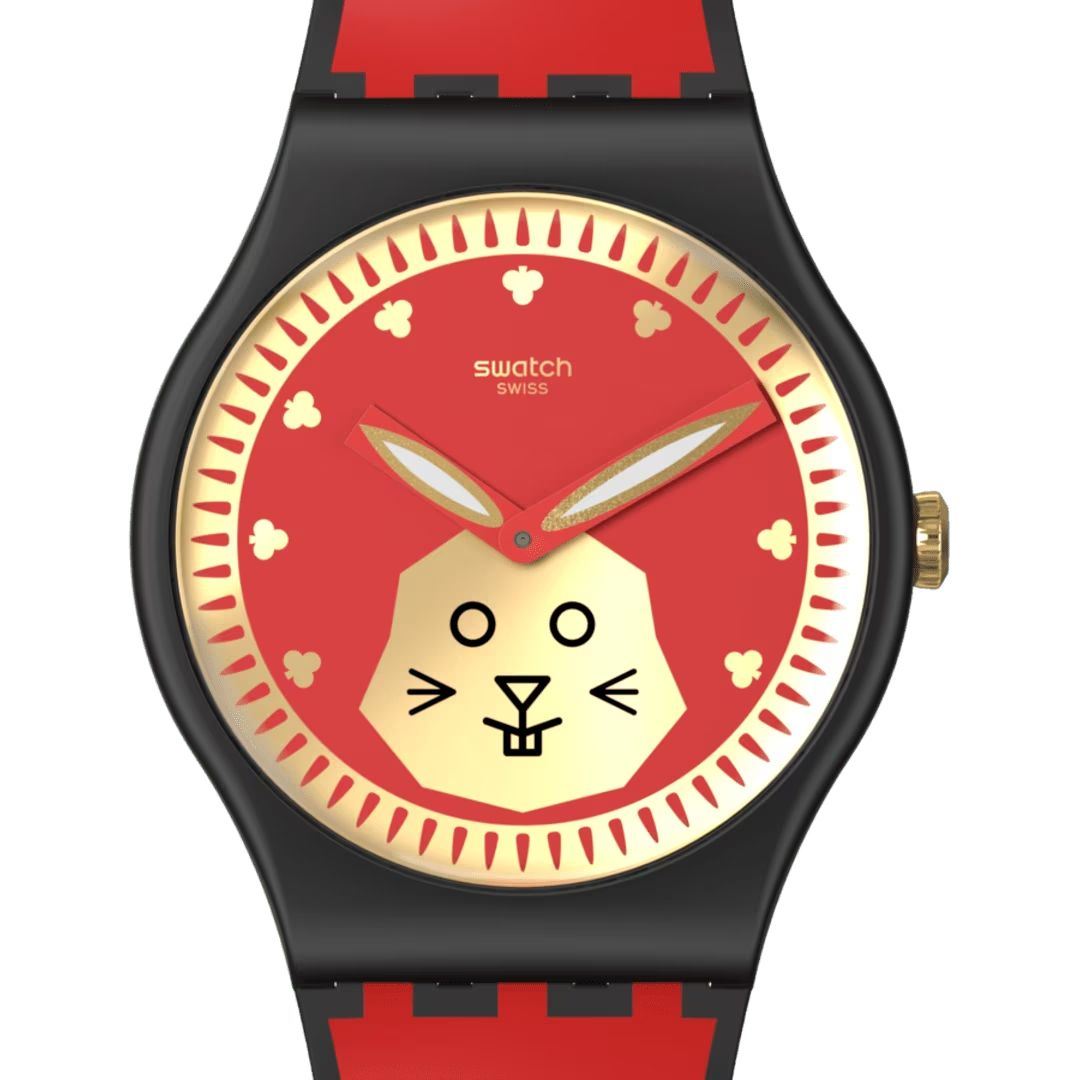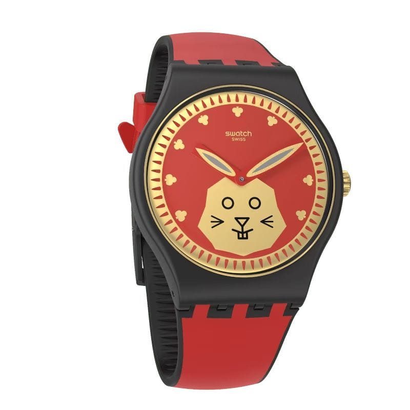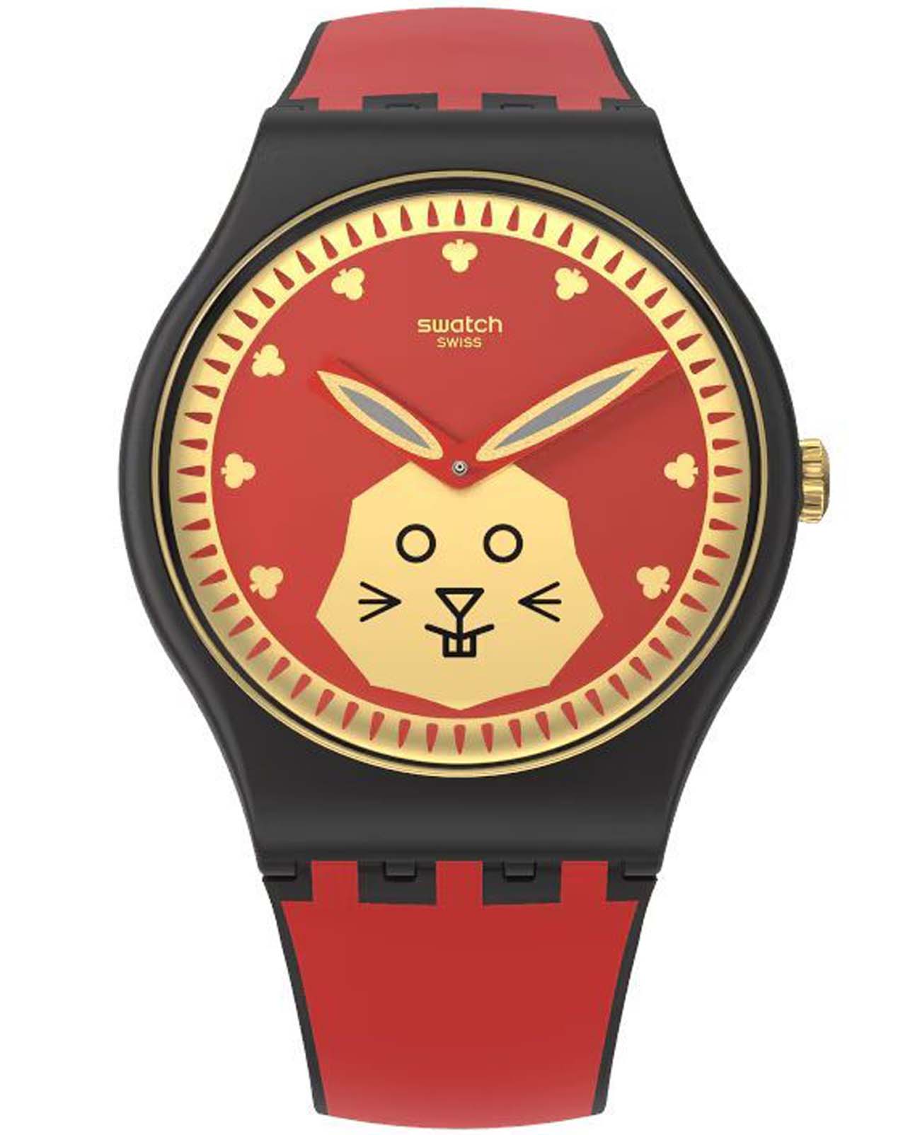 Swatch YEAR OF THE RABBIT (SO32Z107) - это специальная модель часов, посвященная китайскому Новому году 2023 (году Кролика). Часы имеют черный корпус из биокерамики, золотистый циферблат с красным и черным принтом, и силиконовый ремешок. На циферблате изображена мордочка кролика, а стрелки выполнены в виде кроличьих ушей. Ремешок украшен красным принтом и петлей в форме кроличьих ушей. Часы водонепроницаемы до 30 метров, имеют кварцевый механизм и диаметр корпуса 41 мм. Модель унисекс сочетает в себе традиционные китайские символы удачи с инновационными материалами Swatch.
