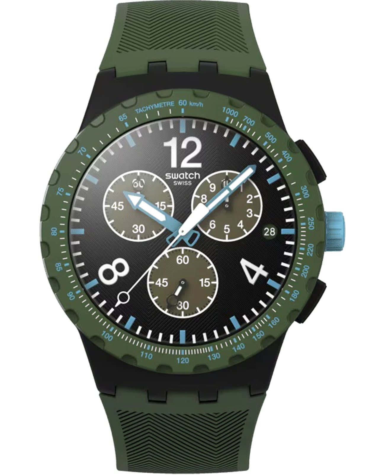 Мужские наручные часы-хронографХронографФункция позволяет измерять отрезки времени с особой точностью: часы, минуты, секунды. Верным признаком хронографа является наличие на циферблате 3 дополнительных окошек-счётчиков. Swatch OLIVE RUSH SUSB421 — это стильный и современный аксессуар для тех, кто ценит лёгкость и комфорт. Корпус выполнен из пластика, диаметром 42 мм и толщиной 14.03 мм, что обеспечивает долговечность и утончённый внешний вид. Циферблат защищён органическим стеклом, устойчивым к повреждениям. Модель оснащена кварцевым механизмом, обеспечивающим высокую точность хода. Часовая и минутная стрелки с люминесцентным покрытиемЛюминесцентное покрытиеПозволяет считывать показания времени в темноте. Производители наносят на стрелки, часовые индексы, безель или поверхность циферблата светонакопительный состав, дающий холодное свечение.. БезельБезельВнешний ободок, закрепляющий стекло. В спортивных часах так называется поворотное кольцо с делениями на циферблате, выполняет роль таймера – замеряет отрезки времени на шкале. Неподвижный безель – элемент декора. Однонаправленно вращающийся безель на дайверских часах позволяет фиксировать моменты погружения и выныривания на поверхность. со шкалой тахиметраТахиметрРазмеченная шкала, располагается на ободке или безеле часов. Тахиметр позволяет рассчитать скорость на определённом участке пути, расстояние измеряется в километрах или милях.. Окошко даты находится в положении 3 часа. Силиконовый текстурированный ремешок на стандартной застёжке гармонично дополняет корпус и обеспечивает комфортное ношение. Водозащита 30 метров позволит защитить корпус от случайных брызг или капель дождя. Эти часы подойдут для повседневного ношения и станут ярким акцентом в вашем наряде.