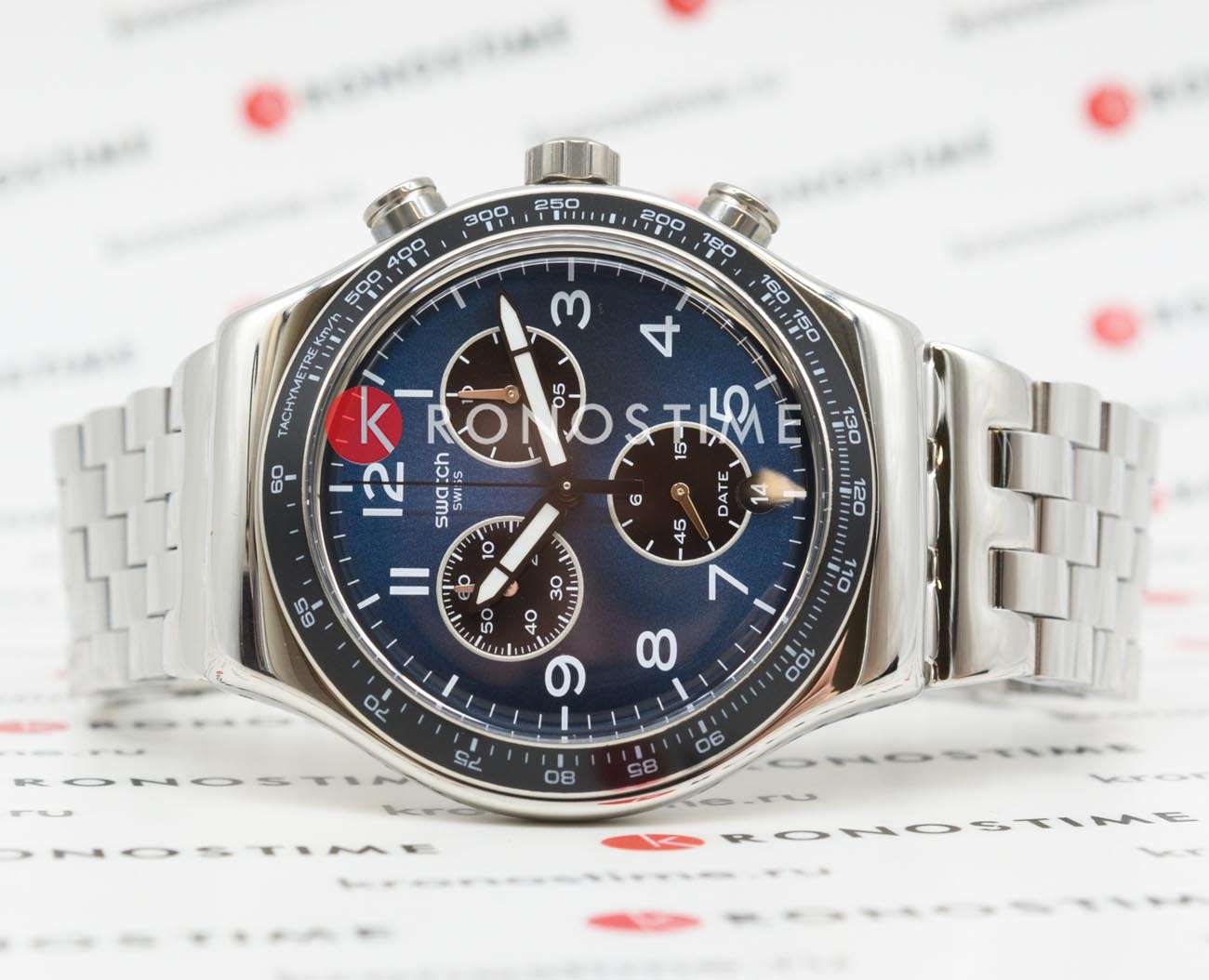 Часы Swatch YVS423GC — это стильный и современный аксессуар для тех, кто ценит лёгкость и комфорт. Этот стильный хронографХронографФункция позволяет измерять отрезки времени с особой точностью: часы, минуты, секунды. Верным признаком хронографа является наличие на циферблате 3 дополнительных окошек-счётчиков. с неподвластным времени дизайном для тех, кто всегда в пути, имеют матовый синий циферблат с белыми арабскими цифрами, серебристыми и белыми принтами, три счетчика и окошко даты в положении "6 часов". Изысканный стиль часов подчеркивают корпус из полированной нержавеющей стали и черный безельБезельВнешний ободок, закрепляющий стекло. В спортивных часах так называется поворотное кольцо с делениями на циферблате, выполняет роль таймера – замеряет отрезки времени на шкале. Неподвижный безель – элемент декора. Однонаправленно вращающийся безель на дайверских часах позволяет фиксировать моменты погружения и выныривания на поверхность. с PVDPVDУльтратонкое покрытие наносится в технике вакуумного напыления, сочетает в себе нитрид титана особой прочности со слоем золота или оксида хрома. Несёт в себе декоративную или защитную функцию. покрытием. Ремешок из полированной нержавеющей стали с традиционным узором звеньев и раскладной застёжкойРаскладная застёжкаТакой тип застёжки используется только на браслетах из металла. Она никогда не раскрывается полностью, происходит разделение на 2 и более частей. Раскладывающая застёжка снизит вероятность потери часов к минимуму. дополняют дизайн. На часовую, минутную стрелки нанесено люминесцентное покрытиеЛюминесцентное покрытиеПозволяет считывать показания времени в темноте. Производители наносят на стрелки, часовые индексы, безель или поверхность циферблата светонакопительный состав, дающий холодное свечение., которое светится в темноте, создавая необычное изображение. Водозащита 30 метров делает часы практичными для повседневного использования. Эти часы подойдут для повседневного ношения и станут ярким акцентом в вашем наряде.