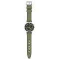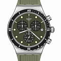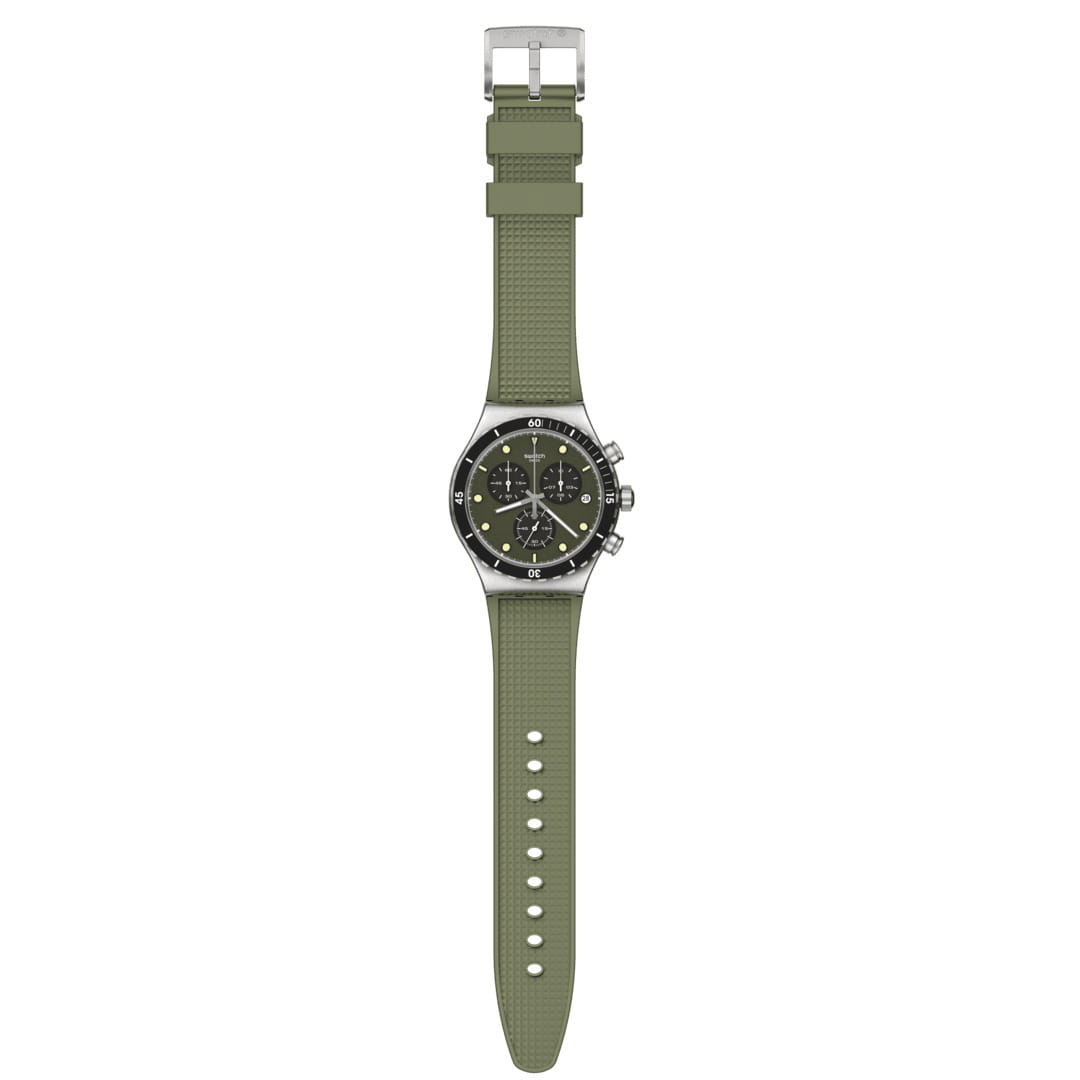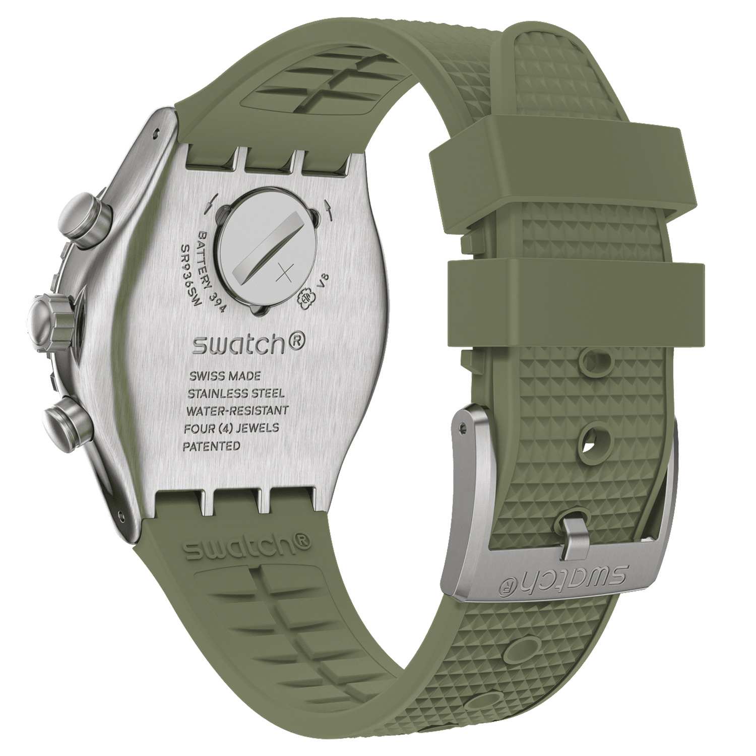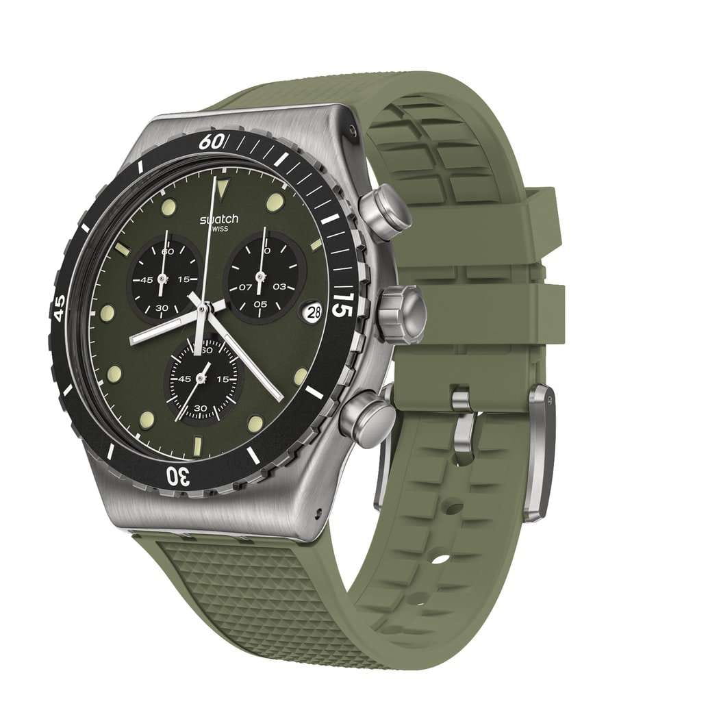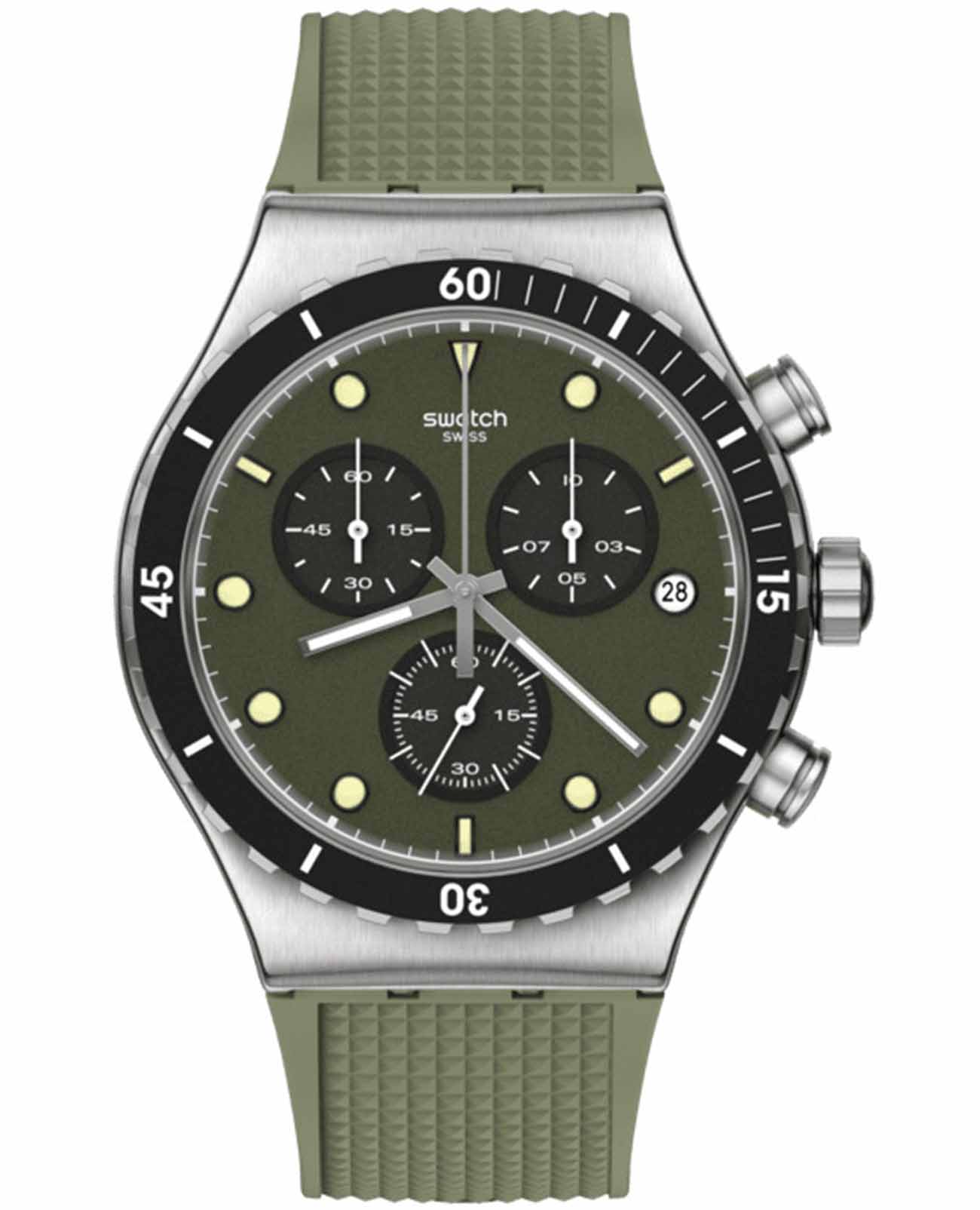 Часы Swatch YVS488 — это стильный и современный аксессуар для тех, кто ценит лёгкость и комфорт. Эта стильная модель часов из нержавеющей стали дополнена зеленым каучуковым ремешком с фактурным верхом и матовой застежкой из нержавеющей стали. Но изюминка этих часов — матовый зеленый циферблат с черными счетчиками хронографаХронографФункция позволяет измерять отрезки времени с особой точностью: часы, минуты, секунды. Верным признаком хронографа является наличие на циферблате 3 дополнительных окошек-счётчиков., индексами и стрелками с люминесцентным покрытиемЛюминесцентное покрытиеПозволяет считывать показания времени в темноте. Производители наносят на стрелки, часовые индексы, безель или поверхность циферблата светонакопительный состав, дающий холодное свечение..  Завершают образ индикатор даты в положении «3 часа» на циферблате, а также серебристые цифры и индексы на безелеБезельВнешний ободок, закрепляющий стекло. В спортивных часах так называется поворотное кольцо с делениями на циферблате, выполняет роль таймера – замеряет отрезки времени на шкале. Неподвижный безель – элемент декора. Однонаправленно вращающийся безель на дайверских часах позволяет фиксировать моменты погружения и выныривания на поверхность. из нержавеющей стали с черным PVDPVDУльтратонкое покрытие наносится в технике вакуумного напыления, сочетает в себе нитрид титана особой прочности со слоем золота или оксида хрома. Несёт в себе декоративную или защитную функцию. покрытием. Водозащита 30 метров делает часы практичными для повседневного использования. Эти часы подойдут для повседневного ношения и станут ярким акцентом в вашем наряде.