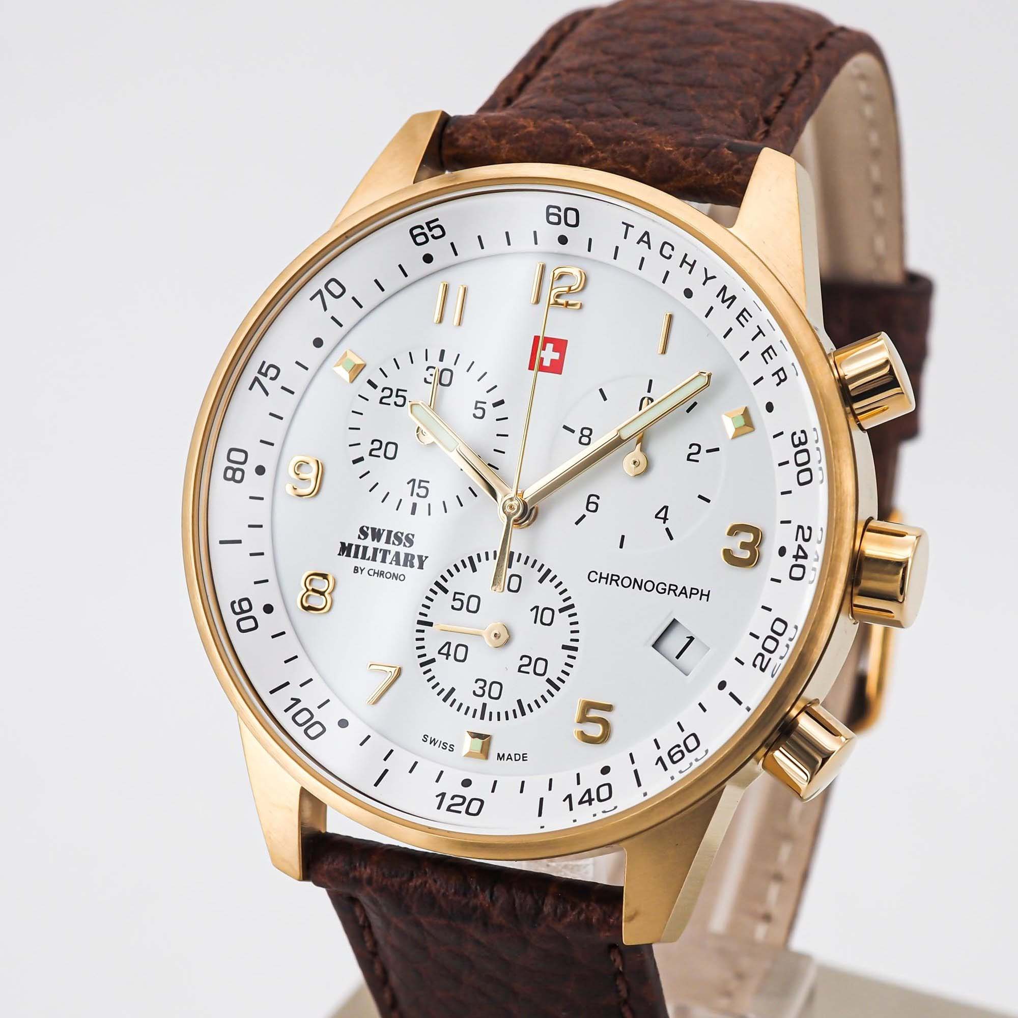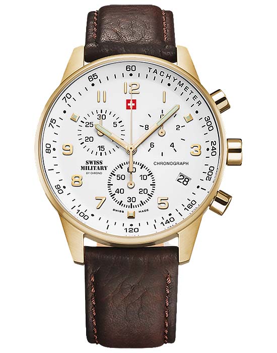 Стильные швейцарские наручные часы-хронографХронографФункция позволяет измерять отрезки времени с особой точностью: часы, минуты, секунды. Верным признаком хронографа является наличие на циферблате 3 дополнительных окошек-счётчиков. Swiss Military by Chrono SM34012.07 как нельзя лучше подойдут ценителям современных техно-решений . Вся корпусная часть, за исключением минерального стекла, состоит из инновационной нержавейки с особым PVD-покрытиемPVDУльтратонкое покрытие наносится в технике вакуумного напыления, сочетает в себе нитрид титана особой прочности со слоем золота или оксида хрома. Несёт в себе декоративную или защитную функцию.. Она делает стекло наручных часов Свисс Милитари еще прочнее и позволяет держать уровень водозащиты.Механизм: ETA G10.211.