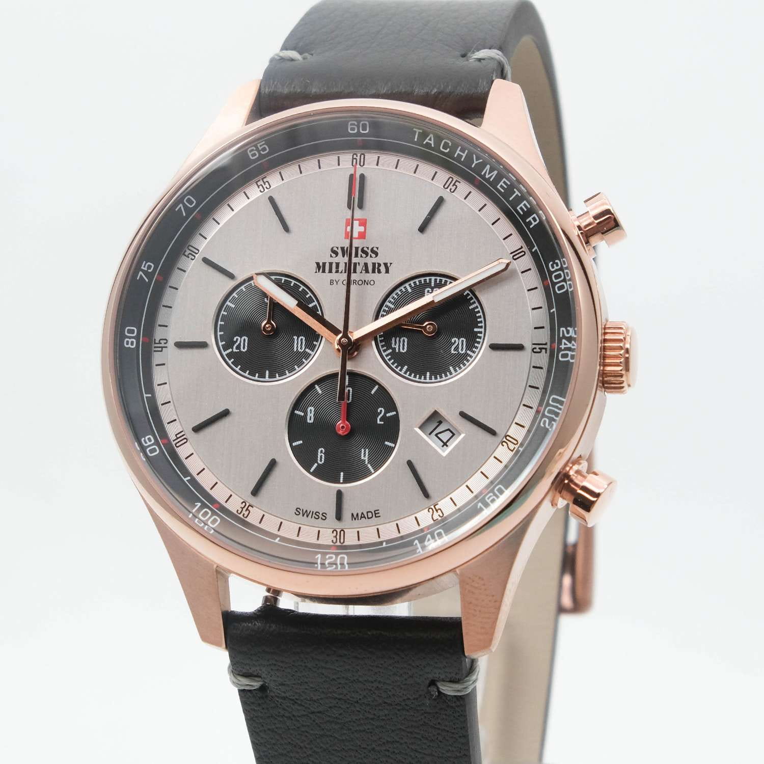 Мужские швейцарские наручные часы-хронографХронографФункция позволяет измерять отрезки времени с особой точностью: часы, минуты, секунды. Верным признаком хронографа является наличие на циферблате 3 дополнительных окошек-счётчиков. Swiss Military by Chrono SM34013.09, кварцевый механизм с высокой точностью. Класс водозащиты: 100 метров, позволит плавать, нырять и заниматься другими водными видами спорта. Стрелки с люминесцентным покрытиемЛюминесцентное покрытиеПозволяет считывать показания времени в темноте. Производители наносят на стрелки, часовые индексы, безель или поверхность циферблата светонакопительный состав, дающий холодное свечение.. Корпус часов изготовлен из стали с PVD-покрытиемPVDУльтратонкое покрытие наносится в технике вакуумного напыления, сочетает в себе нитрид титана особой прочности со слоем золота или оксида хрома. Несёт в себе декоративную или защитную функцию.. Минеральное стеклоМинеральное стеклоМинеральное стекло представляет собой искусственно выращенный минерал кварца. Такое стекло отличается особой устойчивостью к повреждениям и царапинам. Уступает по некоторым качествам сапфировому стеклу.. Ремешок с классической застежкой.