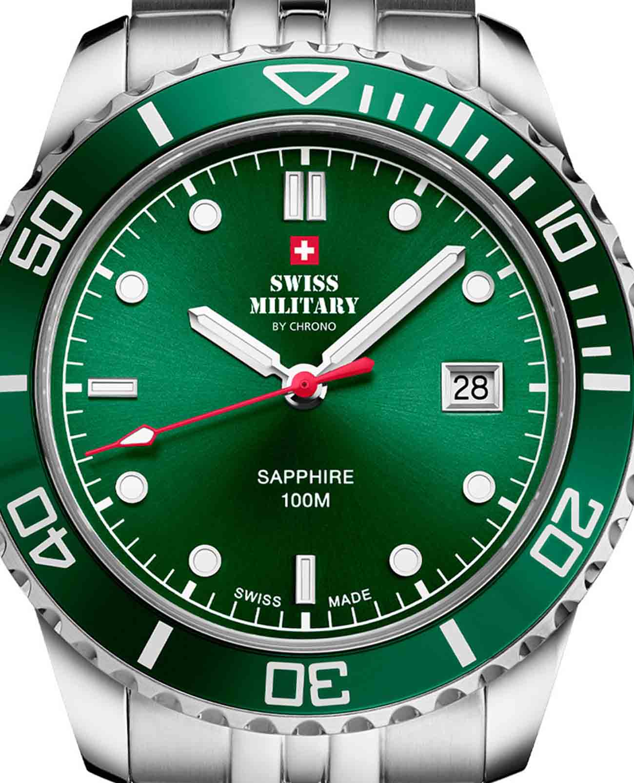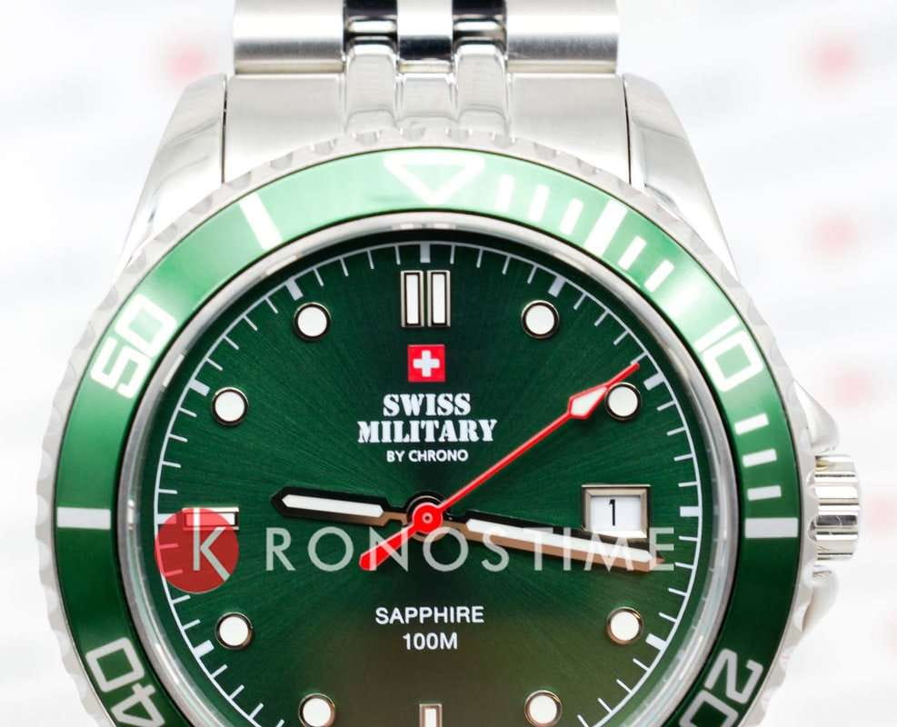 Модель SM34109.03 от Swiss Military by Chrono — это надёжные швейцарские спортивные часы, сочетающие в себе прочность, функциональность и элегантный дизайн. Корпус и браслет выполнены из нержавеющей стали, подчёркивая прочность и элегантность конструкции. Циферблат с солнечным узором и крупными метками, покрытыми люминесцентным покрытиемЛюминесцентное покрытиеПозволяет считывать показания времени в темноте. Производители наносят на стрелки, часовые индексы, безель или поверхность циферблата светонакопительный состав, дающий холодное свечение., обеспечивает отличную читаемость в любых условиях. Часы оснащены швейцарским кварцевым механизмом, обеспечивающим точный ход. Циферблат защищён сапфировым стекломСапфировое стеклоПрочный и надёжный материал из кристалла сапфира синтетического происхождения, характеризующийся особой твёрдостью и устойчивостью к царапинам и повреждениям., устойчивым к царапинам. Установлена раскладная застёжкаРаскладная застёжкаТакой тип застёжки используется только на браслетах из металла. Она никогда не раскрывается полностью, происходит разделение на 2 и более частей. Раскладывающая застёжка снизит вероятность потери часов к минимуму. для надёжной фиксации на запястье. Односторонний вращающийся безель с PVD-покрытиемPVDУльтратонкое покрытие наносится в технике вакуумного напыления, сочетает в себе нитрид титана особой прочности со слоем золота или оксида хрома. Несёт в себе декоративную или защитную функцию. позволяет точно отслеживать время. Модель обладает водонепроницаемостью до 100 метров, что делает её подходящей для плавания и сноркелинга.