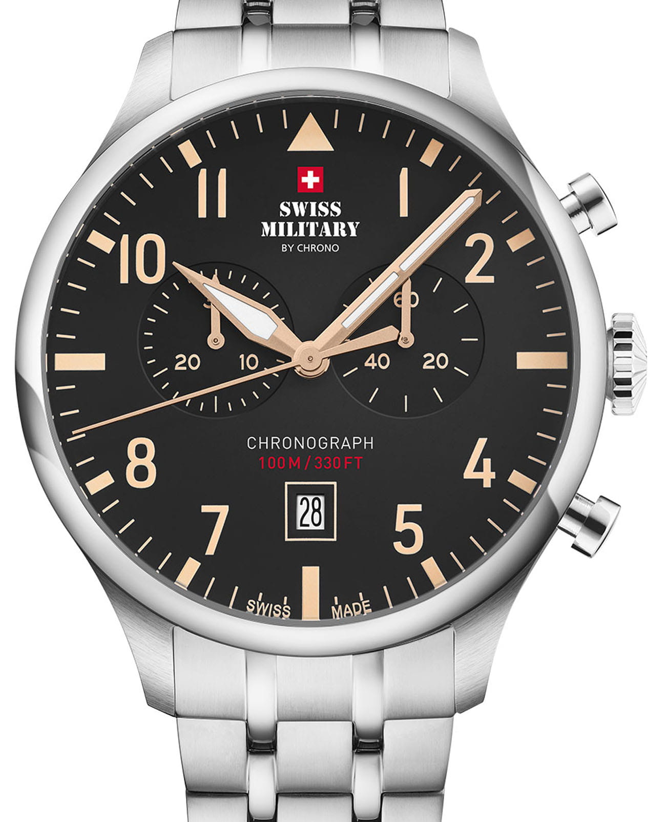 Мужские швейцарские часы-хронографХронографФункция позволяет измерять отрезки времени с особой точностью: часы, минуты, секунды. Верным признаком хронографа является наличие на циферблате 3 дополнительных окошек-счётчиков. с секундомеромСекундомерСекундоме́р — прибор, способный измерять интервалы времени с точностью до долей секунды. Swiss Military by Chrono Vintage Chronograph SM34098.04, кварцевый механизм с высокой точностью. Сапфировое стеклоСапфировое стеклоПрочный и надёжный материал из кристалла сапфира синтетического происхождения, характеризующийся особой твёрдостью и устойчивостью к царапинам и повреждениям. устойчивое к мелким механическим повреждениям. Корпус часов изготовлен из нержавеющей стали. На циферблате расположены два дополнительных индикатора и окошко даты. Окошко даты находится в положении 6 часов. Стрелки с люминесцентным покрытиемЛюминесцентное покрытиеПозволяет считывать показания времени в темноте. Производители наносят на стрелки, часовые индексы, безель или поверхность циферблата светонакопительный состав, дающий холодное свечение.. Класс водозащиты: 100 метров, позволит плавать, нырять и заниматься другими водными видами спорта. Стальной браслет на раскладной застёжкеРаскладная застёжкаТакой тип застёжки используется только на браслетах из металла. Она никогда не раскрывается полностью, происходит разделение на 2 и более частей. Раскладывающая застёжка снизит вероятность потери часов к минимуму..