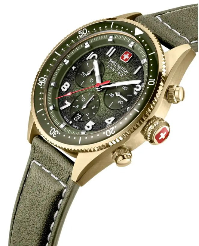 Мужские наручные часы-хронографХронографФункция позволяет измерять отрезки времени с особой точностью: часы, минуты, секунды. Верным признаком хронографа является наличие на циферблате 3 дополнительных окошек-счётчиков. Swiss Military Hanowa SMWGC0003802 из коллекции Greyhound Chrono сочетают в себе спортивный дизайн и надежность современных технологий. Модель обладает круглым корпусом диаметром 45 мм, изготовленным из нержавеющей стали, что обеспечивает высокую устойчивость к внешним воздействиям. Для защиты циферблата используется сапфировое стеклоСапфировое стеклоПрочный и надёжный материал из кристалла сапфира синтетического происхождения, характеризующийся особой твёрдостью и устойчивостью к царапинам и повреждениям., гарантирующее прочную защиту от царапин. БезельБезельВнешний ободок, закрепляющий стекло. В спортивных часах так называется поворотное кольцо с делениями на циферблате, выполняет роль таймера – замеряет отрезки времени на шкале. Неподвижный безель – элемент декора. Однонаправленно вращающийся безель на дайверских часах позволяет фиксировать моменты погружения и выныривания на поверхность. с IP-покрытиемIP-покрытиеМетод ионного напыления. Демонстрирует повышенную устойчивость к истиранию, окислению и химическим веществам. Под воздействием высокого давления и температуры около 1500°C молекулы металла надёжно соединяются с частицами корпуса часов.. Часы оснащены высококачественным швейцарским кварцевым механизмом Ronda 5030, который позволяет точно измерять время благодаря функции секундомераСекундомерСекундоме́р — прибор, способный измерять интервалы времени с точностью до долей секунды.. Циферблат украшен метками в виде арабских цифр и точек, а стрелки и метки покрыты люминесцентным покрытиемЛюминесцентное покрытиеПозволяет считывать показания времени в темноте. Производители наносят на стрелки, часовые индексы, безель или поверхность циферблата светонакопительный состав, дающий холодное свечение., что обеспечивает удобство чтения времени в темноте. Ремешок часов выполнен из натуральной кожи, что добавляет комфорта при длительном ношении. Модель также оснащена окном даты в положении «6 часов», завинчивающейся заводной головкой и имеет водонепроницаемость до 10 атмосфер (100 метров), что позволяет использовать их во время плавания и других водных видов спорта.