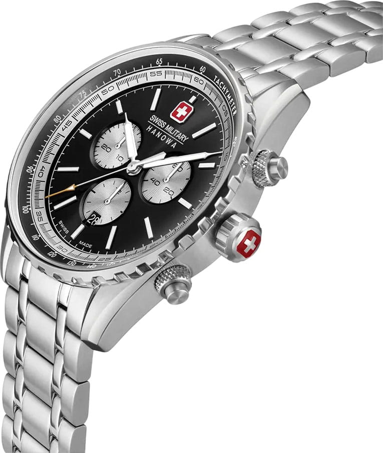 Мужские швейцарские часы Swiss Military Hanowa Afterburn Chrono SMWGI0000309 с хронографомХронографФункция позволяет измерять отрезки времени с особой точностью: часы, минуты, секунды. Верным признаком хронографа является наличие на циферблате 3 дополнительных окошек-счётчиков. и секундомеромСекундомерСекундоме́р — прибор, способный измерять интервалы времени с точностью до долей секунды.. Сапфировое стеклоСапфировое стеклоПрочный и надёжный материал из кристалла сапфира синтетического происхождения, характеризующийся особой твёрдостью и устойчивостью к царапинам и повреждениям. с антибликовым покрытием защищает циферблат от царапин и обеспечивает отличную читаемость при любом освещении. Корпус из нержавеющей стали диаметром 44 мм сбалансирован и элегантен. Браслет с раскладной застёжкойРаскладная застёжкаТакой тип застёжки используется только на браслетах из металла. Она никогда не раскрывается полностью, происходит разделение на 2 и более частей. Раскладывающая застёжка снизит вероятность потери часов к минимуму. идеально дополняют дизайн часов, обеспечивая комфортное ношение. Люминесцентное покрытиеЛюминесцентное покрытиеПозволяет считывать показания времени в темноте. Производители наносят на стрелки, часовые индексы, безель или поверхность циферблата светонакопительный состав, дающий холодное свечение. стрелок и меток позволит вам следить за временем даже в полной темноте. Стальной безельБезельВнешний ободок, закрепляющий стекло. В спортивных часах так называется поворотное кольцо с делениями на циферблате, выполняет роль таймера – замеряет отрезки времени на шкале. Неподвижный безель – элемент декора. Однонаправленно вращающийся безель на дайверских часах позволяет фиксировать моменты погружения и выныривания на поверхность. с PVD-покрытиемPVDУльтратонкое покрытие наносится в технике вакуумного напыления, сочетает в себе нитрид титана особой прочности со слоем золота или оксида хрома. Несёт в себе декоративную или защитную функцию.. Часы оснащены центральной секундной стрелкой и окошком даты в положении «6 часов», что делает их функциональными для повседневного использования. ТахиметрТахиметрРазмеченная шкала, располагается на ободке или безеле часов. Тахиметр позволяет рассчитать скорость на определённом участке пути, расстояние измеряется в километрах или милях. по внешнему краю. Водонепроницаемость до 100 метров. Идеальный выбор для тех, кто ценит качество и долговечность.