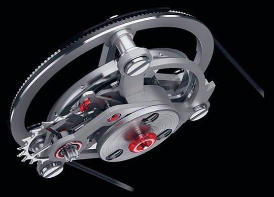 Революционные часы покорят вас и всех окружающих своим уникальным дизайном и механизмом. Monaco V4 Tourbillon. Лимитированная серия - 50 экземпляров. Скелетонизированные часы. Турбийон закреплен на V-образном мосту, который приводится в движение революционным механизмом на кожаных ремнях. Толщина ремней 0,07мм, что соответствует толщине человеческого волоса. В механизме 214 деталей, 46 камней, частота 28800 полуколебаний в час. Четыре заводных барабана механизма обеспечивают 40-часовой запас хода. Циферблат украшен гравировкой Cotes de Geneve и яркими рубиновыми камнями, так хорошо контрастирующими с черным цветом. Сапфировое стеклоСапфировое стеклоПрочный и надёжный материал из кристалла сапфира синтетического происхождения, характеризующийся особой твёрдостью и устойчивостью к царапинам и повреждениям. с двухсторонним антибликовым покрытием позволит наблюдать за работой механизма даже в самый солнечный день. Прозрачная сапфировая задняя крышка. Ремешок с раскладывающейся застежкой.