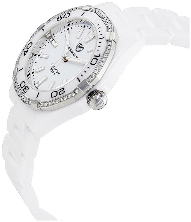 TAG Heuer Aquaracer WAY1396.BH0717 — элегантные женские часы, сочетающие стиль и функциональность. Корпус диаметром 35 мм выполнен из стали с белой матовой керамикой, обеспечивающей лёгкость и устойчивость к царапинам. Белый циферблат оснащён накладными часовыми метками и стрелками с люминесцентным покрытиемЛюминесцентное покрытиеПозволяет считывать показания времени в темноте. Производители наносят на стрелки, часовые индексы, безель или поверхность циферблата светонакопительный состав, дающий холодное свечение., обеспечивающим отличную читаемость в любых условиях освещения. Часы оснащены точным кварцевым механизмом, обеспечивающим стабильное отображение времени. Функциональность включает индикацию часов, минут, секунд и даты, расположенной на отметке «3 часа». БезельБезельВнешний ободок, закрепляющий стекло. В спортивных часах так называется поворотное кольцо с делениями на циферблате, выполняет роль таймера – замеряет отрезки времени на шкале. Неподвижный безель – элемент декора. Однонаправленно вращающийся безель на дайверских часах позволяет фиксировать моменты погружения и выныривания на поверхность. однонаправленный вращающийся, выполнен из стали и керамики украшен 60 бриллиантами и является устойчивыми к царапинам. Водозащита до 300 метров (30 бар) делает модель подходящей для дайвинга и активного образа жизни. Браслет из чёрной матовой керамики оснащён раскладной застёжкойРаскладная застёжкаТакой тип застёжки используется только на браслетах из металла. Она никогда не раскрывается полностью, происходит разделение на 2 и более частей. Раскладывающая застёжка снизит вероятность потери часов к минимуму. из нержавеющей стали с кнопками для дополнительной безопасности.
