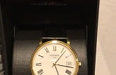 Отображение даты, корпус из стали с PVD-покрытием цвета желтого золота, кожаный ремешок.