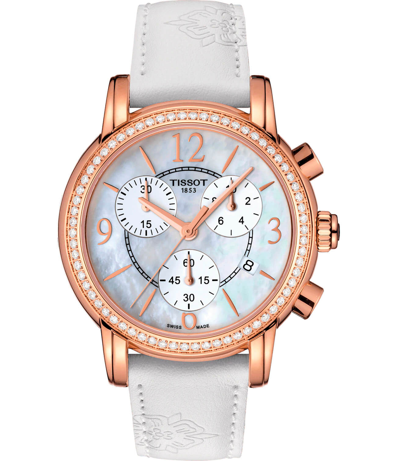 Перламутровый циферблат идеально подходит к белому кожаному ремешку, имеющему оригинальную деталь - цветочный рисунок. Стальной корпус имеет PVD-покрытиеPVDУльтратонкое покрытие наносится в технике вакуумного напыления, сочетает в себе нитрид титана особой прочности со слоем золота или оксида хрома. Несёт в себе декоративную или защитную функцию. оттенка «розовое золото», но главную особенность представляет безельБезельВнешний ободок, закрепляющий стекло. В спортивных часах так называется поворотное кольцо с делениями на циферблате, выполняет роль таймера – замеряет отрезки времени на шкале. Неподвижный безель – элемент декора. Однонаправленно вращающийся безель на дайверских часах позволяет фиксировать моменты погружения и выныривания на поверхность., декорированный по всей окружности 66 бриллиантами. Наручные часы работают за счёт кварцевого калибра ETA G15.211 с высокой точностью хода. Надёжное сапфировое стекло. ХронографХронографФункция позволяет измерять отрезки времени с особой точностью: часы, минуты, секунды. Верным признаком хронографа является наличие на циферблате 3 дополнительных окошек-счётчиков., секундомер, индикация числа. . Габариты: 35 x 35 x 10 мм.