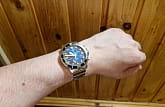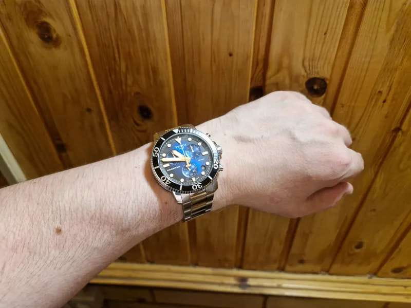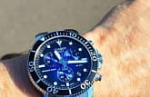 Стильный хронографХронографФункция позволяет измерять отрезки времени с особой точностью: часы, минуты, секунды. Верным признаком хронографа является наличие на циферблате 3 дополнительных окошек-счётчиков. со спортивным дизайном идеально подойдёт к любой одежде, массивный циферблат добавляет солидности и респектабельности. Внутри стального корпуса находится высокоточный кварцевый калибр ETA G10.212. Сохраняется водонепроницаемость при давлении 30 бар, этому способствуют заводная головка и задняя крышка, которые завинчиваются. Люминесцентная подсветкаЛюминесцентное покрытиеПозволяет считывать показания времени в темноте. Производители наносят на стрелки, часовые индексы, безель или поверхность циферблата светонакопительный состав, дающий холодное свечение.. Антибликовое покрытие сапфирового стекла. Застёжка с фиксатором и удлинением для дайверовУдлинение для дайверовЗастёжка с удлинением для дайверов представляет собой безопасное крепление, которое позволяет надевать часы поверх гидрокостюма. Гибкая застёжка удлиняется на 1-2 миллиметра.. Габариты: 45,5 x 45,5 x 12,8 мм.